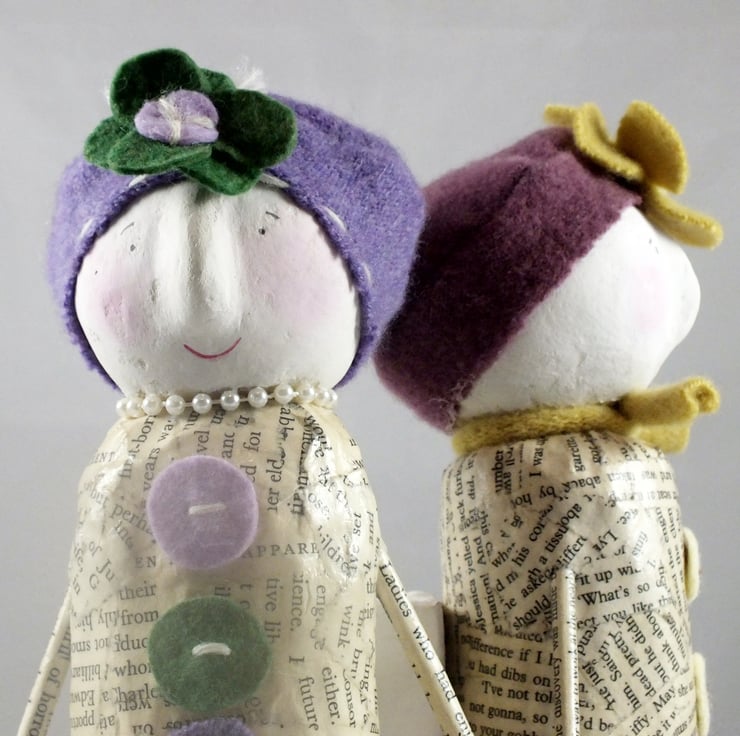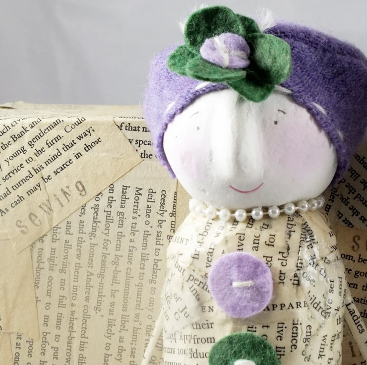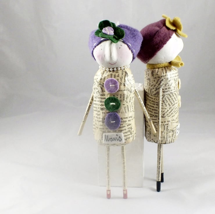 Mavis has a painted paper clay head with a papier mache body and limbs.Her beret is boiled wool with a wool felt flower and 'buttons'. Her name is free machine embroidered onto felt.