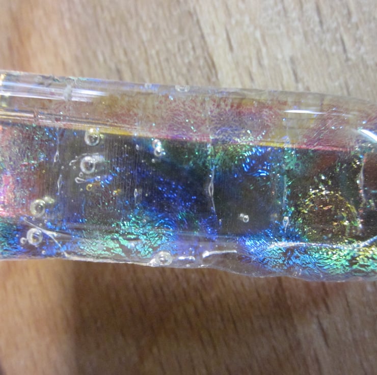 This cabochon is clear with pretty dichroic shimmer rainbow. The ripple dichroic has created a slight wibbly effect - if you want straight lines then these aren't the ones for you! The rainbow dichroic is very difficult to photograph! It is fitted with a silver metal crocodile clip. It is approximately 5cm long.