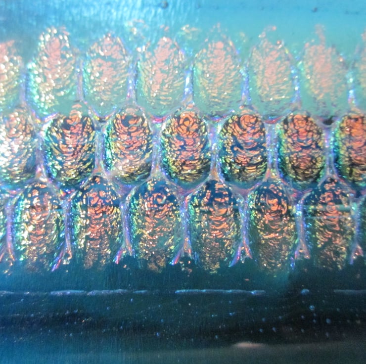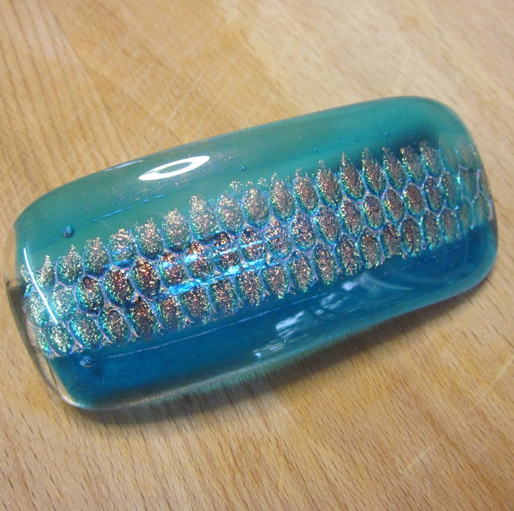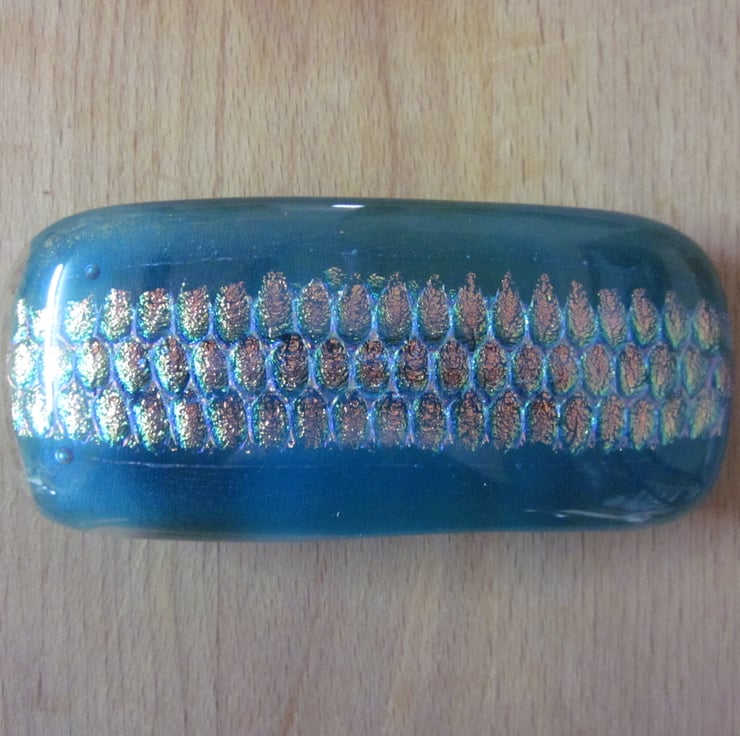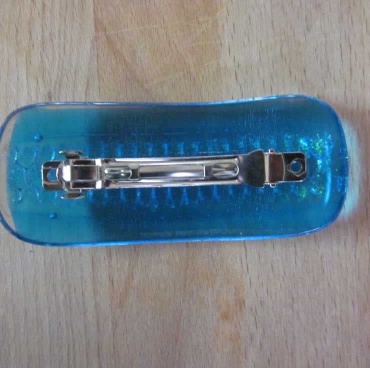 This cabochon is transparent blue with a subtle purple sheen with pretty dichroic fishscale pattern in rainbow shades. It is fitted with a silver coloured metal barrette clip. It is approximately 10 cms long. This quite a large clip and suitable for someone with thicker or longer hair.