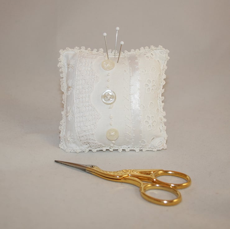 The back of the pincushion is a cream fabric. The back and front panels are blanket stitched together, using white crochet cotton. The picot crochet edging is then worked into the blanket stitch loops. The pincushion is gently stuffed with polyester filling.