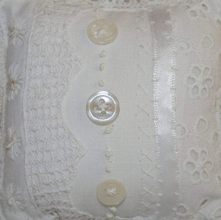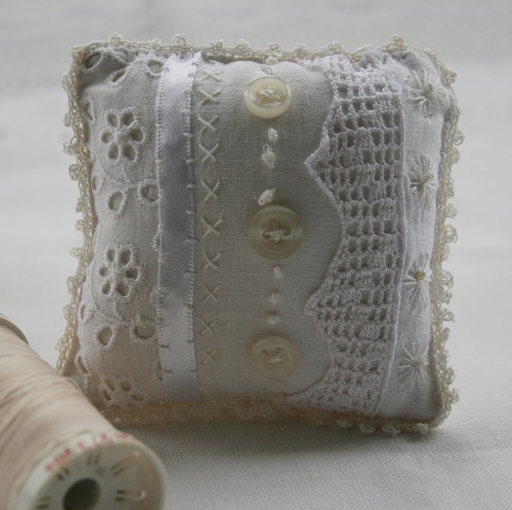 The decorative top of this pincushion has been worked from strip patchwork stitched from vintage ivory linens and a selection of lace, ribbon and vintage buttons from my collection. It has been further embellished by the addition of hand embroidery - stitched in white cotton.