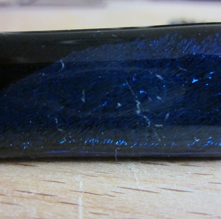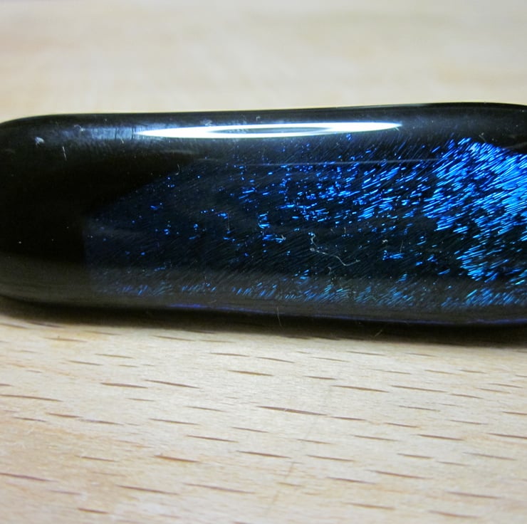 This cabochon is black with a pretty dichroic shimmer in blue/tgreen/turquoise. It is more green than the photographs suggests. It is fitted with a silver metal crocodile clip and is approximately 5cm long.