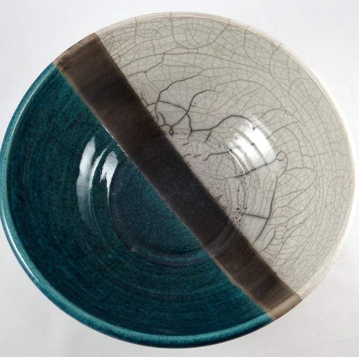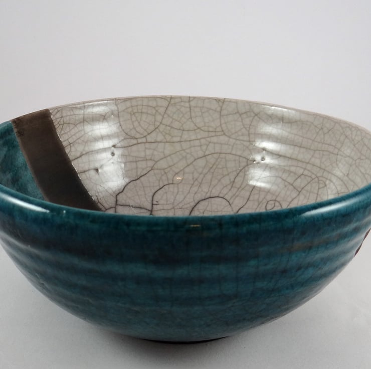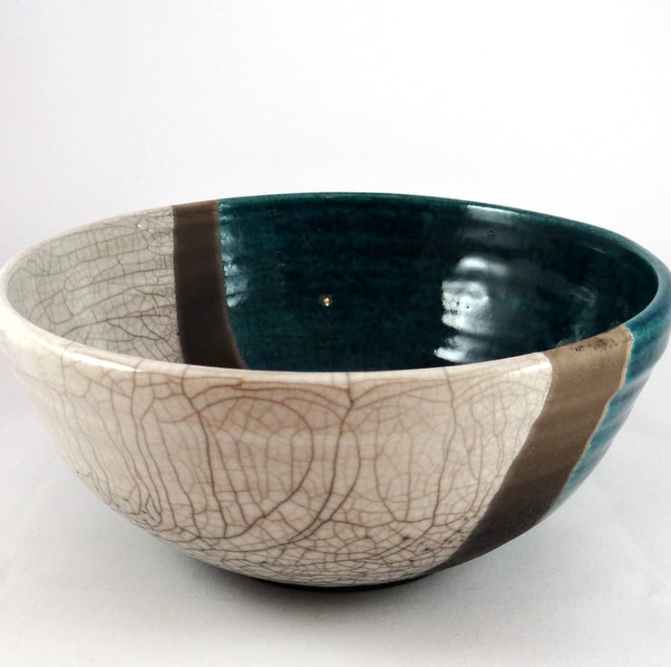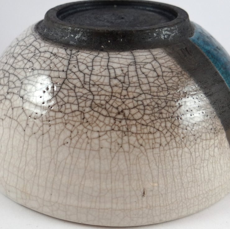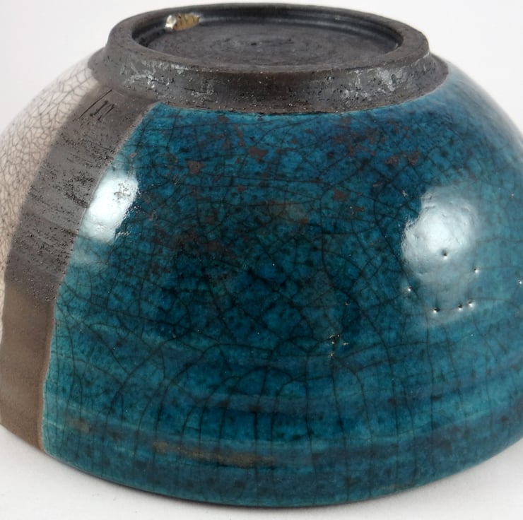 Half of the bowl is coated in a special glaze that shimmers in shades of blue to emerald green, whilst the other half has a cream finish. Both glazes have a soft sheen and are separated by a line of unglazed clay darkened by the smoke that engulfed the bowl in the reduction drum. The thermal shock produced a mix of dramatic and subtle lines.