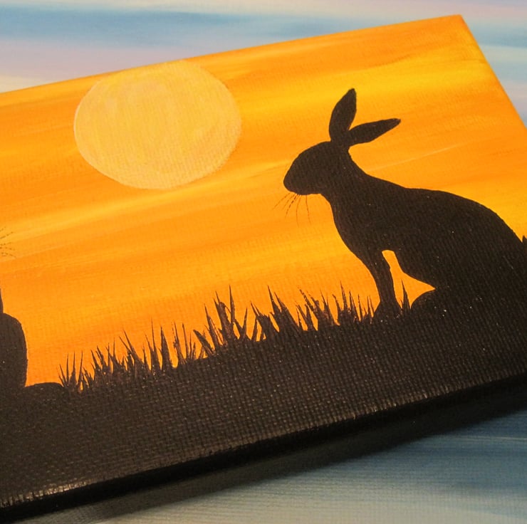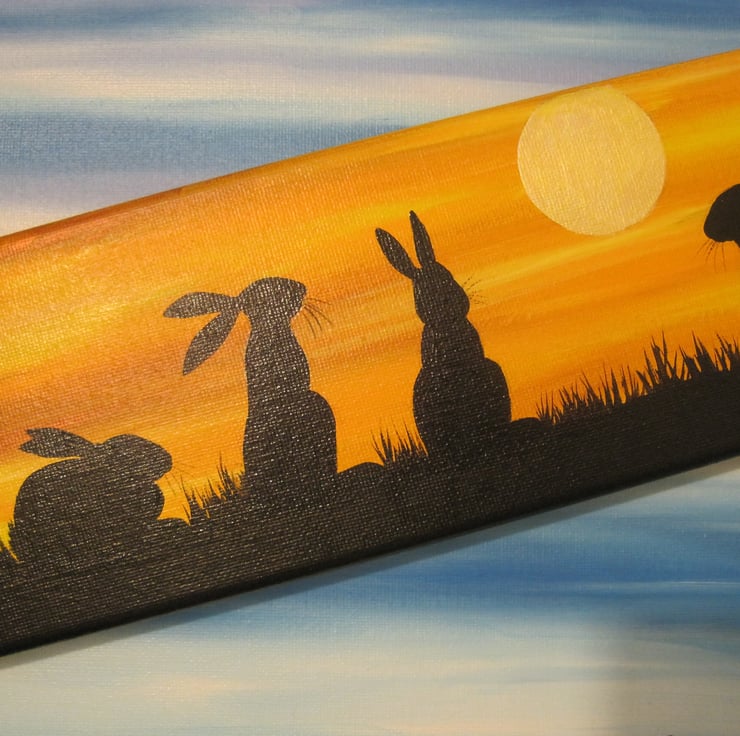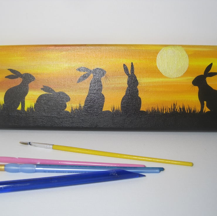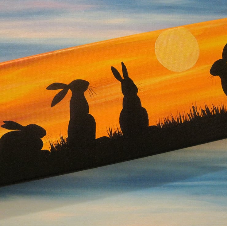 An original acrylic painting of a line up of bunnies silhouetted against a sky in shades of orange, yellow and gold. Was £12, now just £6!