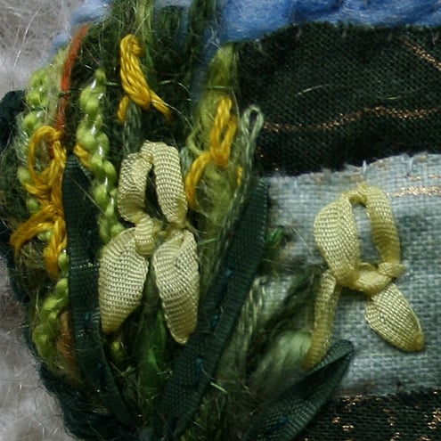Irises clustering at the lakeside form the focus for the design of this brooch, which has been hand-appliqueed and embroidered. The irises, in the foreground, are embroidered using silk ribbons. The design is enlivened by splashes of vivid green. A border of crocheted braid is applied to the brooch, the colours blended to match those of the design. The oval shape is reinforced with recycled plastic from a bottle.