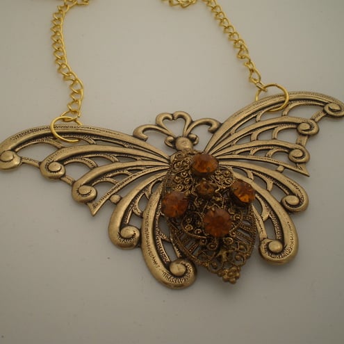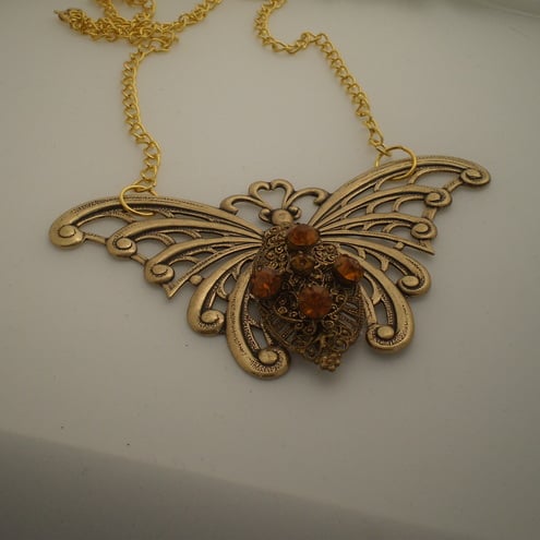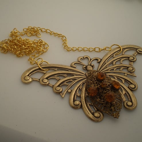 A wonderful bold, dramatic butterfly necklace. Created from an antiqued gold open work butterfly base, combined with a gorgeous Vintage (1940's) ornate, filigree brooch. The stones are Czech glass and area lovely amber colour. This butterfly necklace is a statement piece as it measures 7 x 6cms and hangs from a 18 inch goldtone chain... be daring yourself , or to give to someone who is flamboyant and enjoys the unusual.