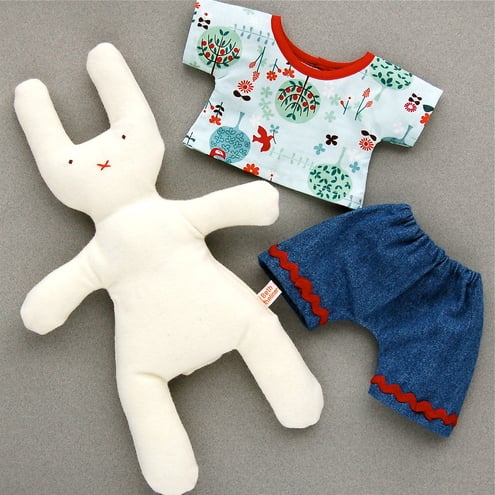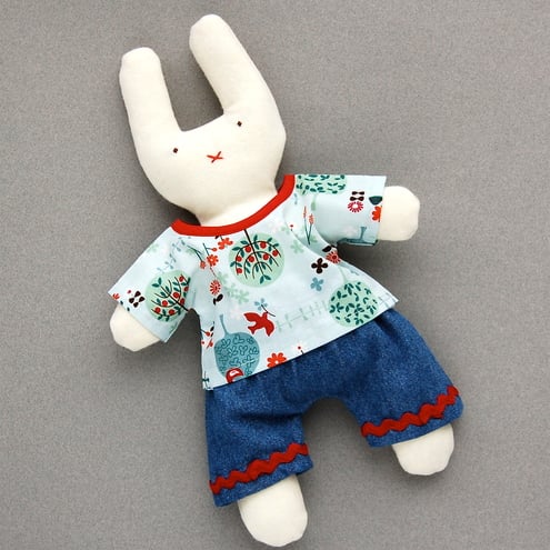 Wool flannel bunny with polyester safety filling and hand embroidered face.
