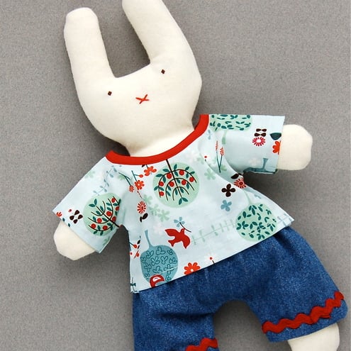Cotton shirt in Birds and Trees print with red trim and denim trousers with red ric-rac.