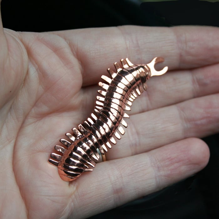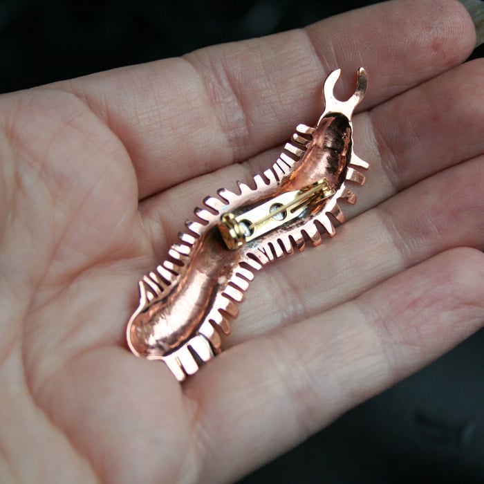 This handmade brooch is made of sheet copper which has been hammered and etched.