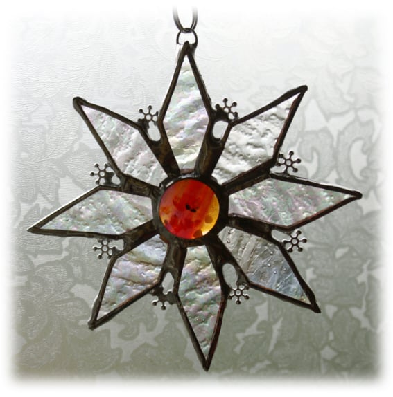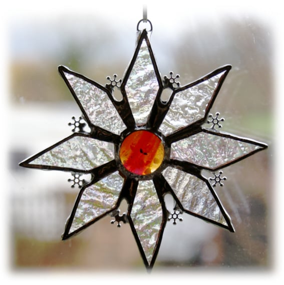 I've designed it with 8 diamond shaped points made from iridescent clear glass and at the centre an amber streaked dichroic glass nugget in the centre which I made in my little Hotpot fusing kiln.