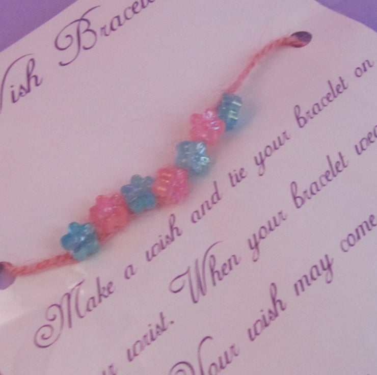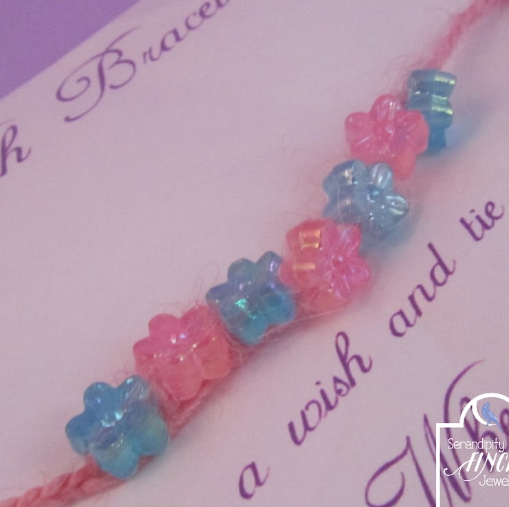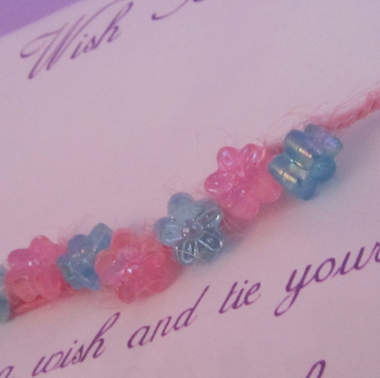 These is a very pretty flower wish bracelet. It is created using pink jute with gorgeous blue and pink plastic flower beads.