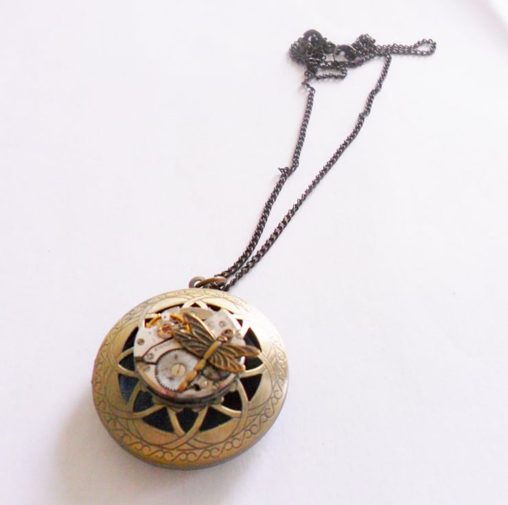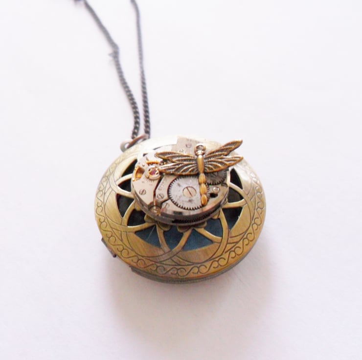 I have created this Steampunk style locket from an antiqued gold filigree locket to which I have added a Vintage watch movement with all the intricate cogs and wheels showing. A dainty dragonfly is resting on top to add a touch of the whimsical.