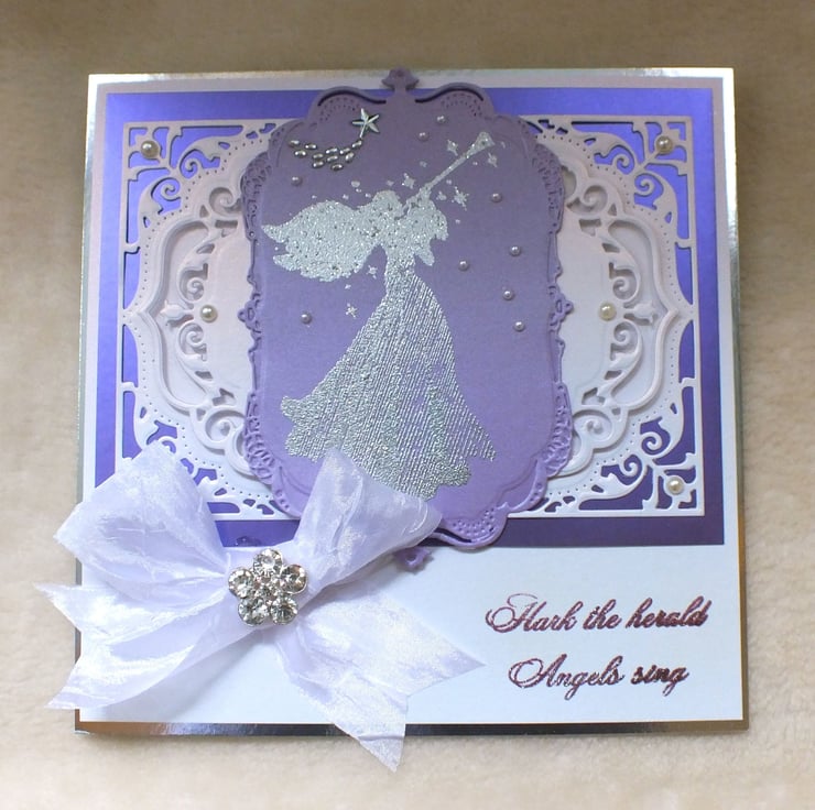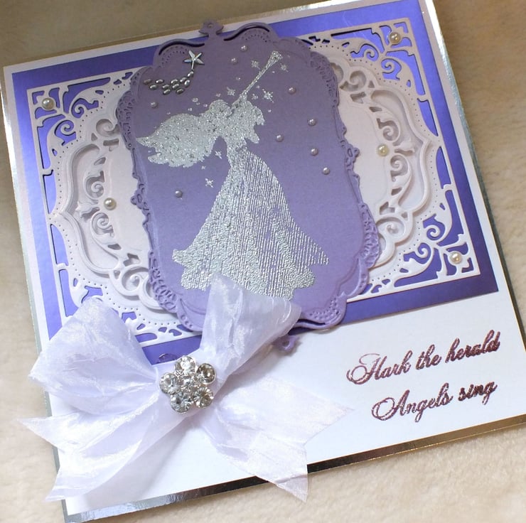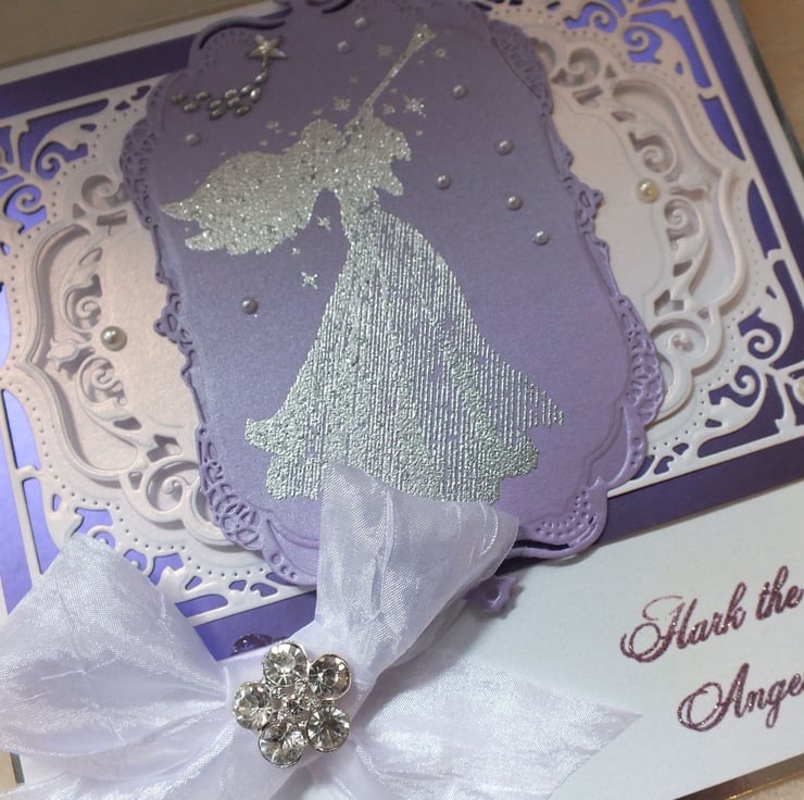 Wonderfully intricate in design, this card uses many different crafting techniques, worthy of someone very special at Christmas. It has been handmade using beautiful die-cuts from premium quality centura pearl card stock, with hand printed angel and verse. Embellished with faux gems and pearls, and finished with a stunning crushed satin bow with flower crystal. The card is large at approx. 8”x8” in size, and includes the sentiment, ‘Merry Christmas’ inside.