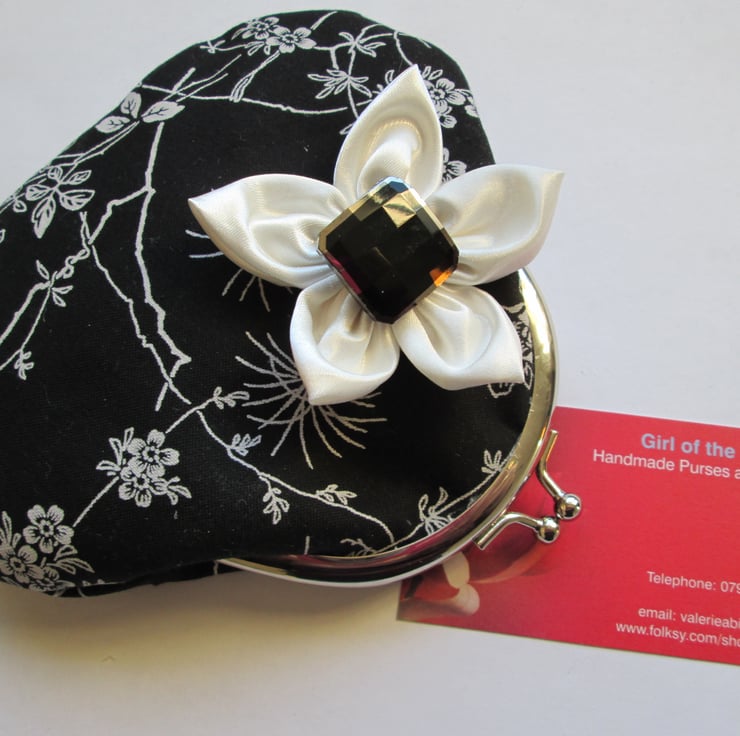 Perfect little purse for your keys, change and credit cards or mobile phone.Pretty black and white fabric with contrasting lining, padding and metal frame clasp.
