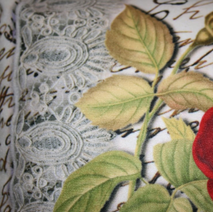 In the foreground is a beautiful illustration of a red flower with bud and leaves.Between the 2 on the left hand side runs a delicate piece of ornate lace from top to bottom.