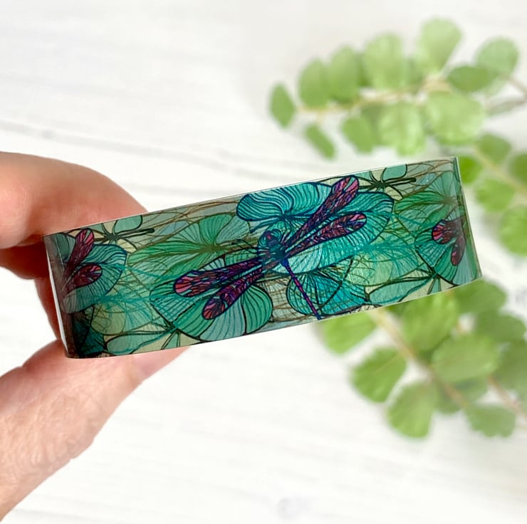 A handmade cuff bracelet with dragonflies and waterlilies design. Handcrafted jewellery, made in the UK. Ideal gift for a nature and dragonfly lover. In addition, for a small extra fee, this bracelet can have a personal message engraved on the reverse (Optional)