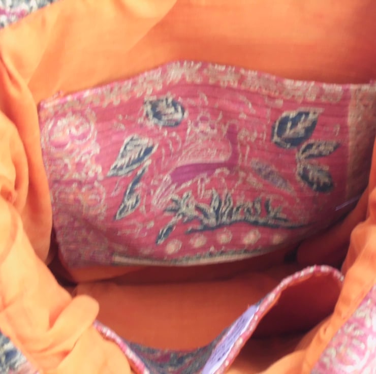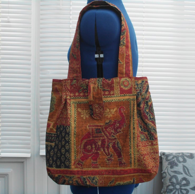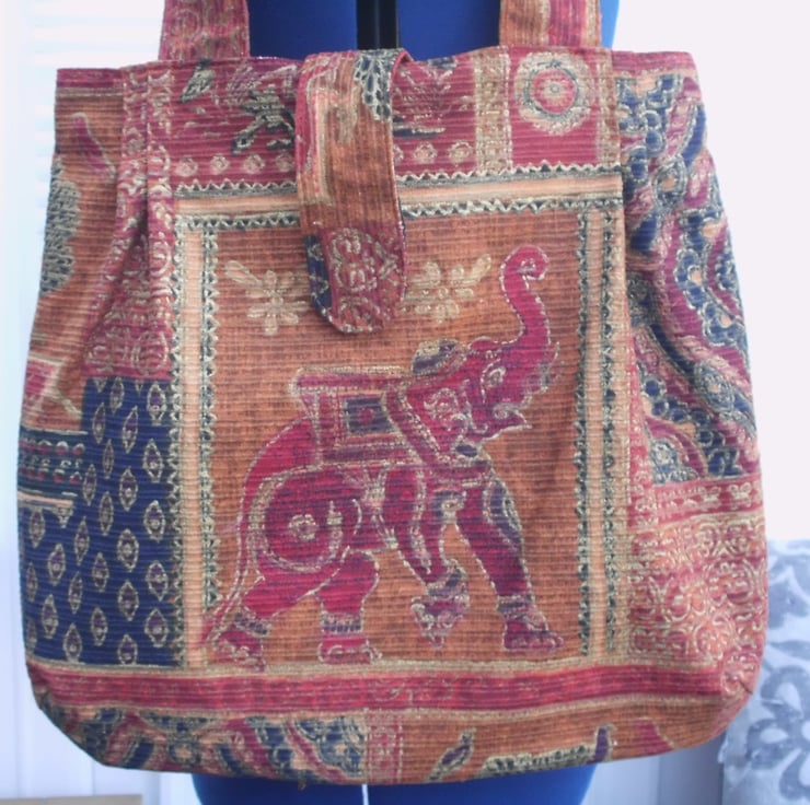 This bag is made from an upholstery fabric with elephants,birds ,trees,flowers and animals printed on it in rich colours .