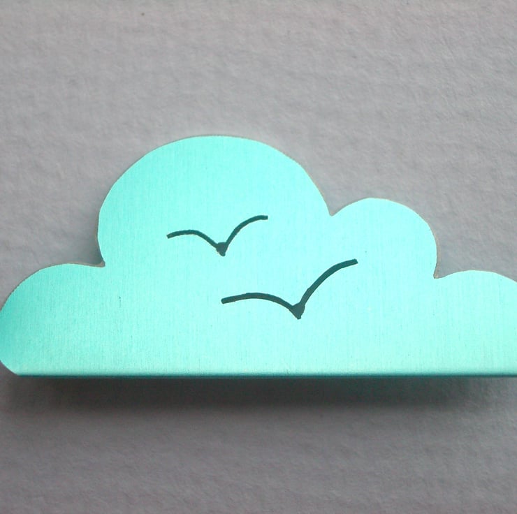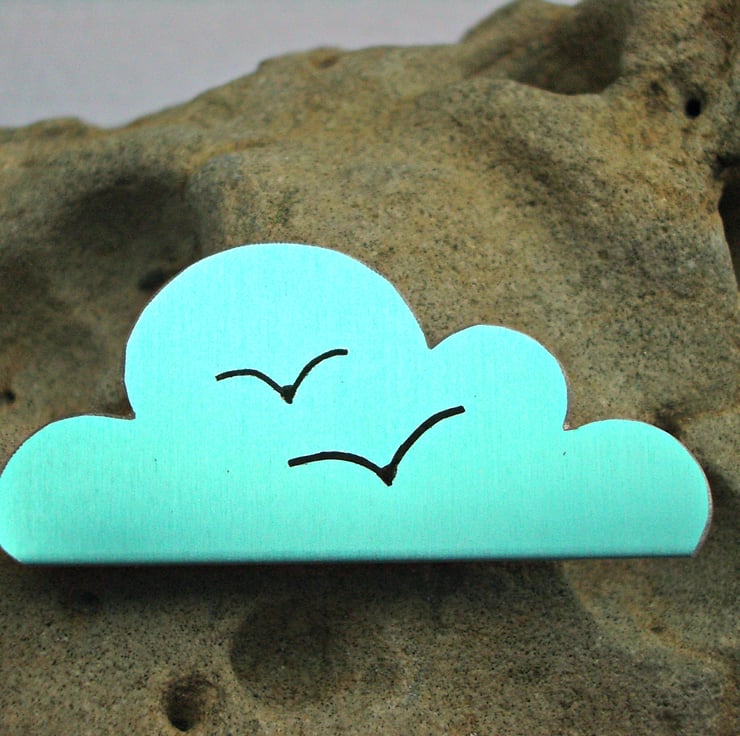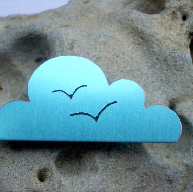 This cloud brooch has been hand made from aluminium which I have dyed a pale blue and sealed so that the dye becomes a permanent part of the metal. I then saw pierce the cloud and seagull shapes by hand and file the edges to give a nice smooth finish.