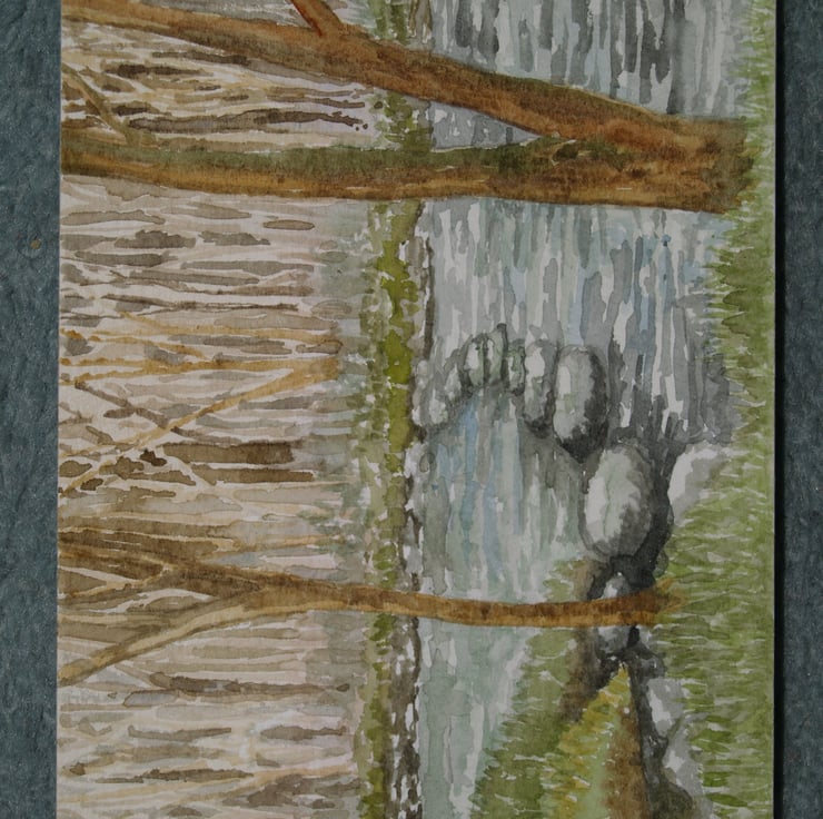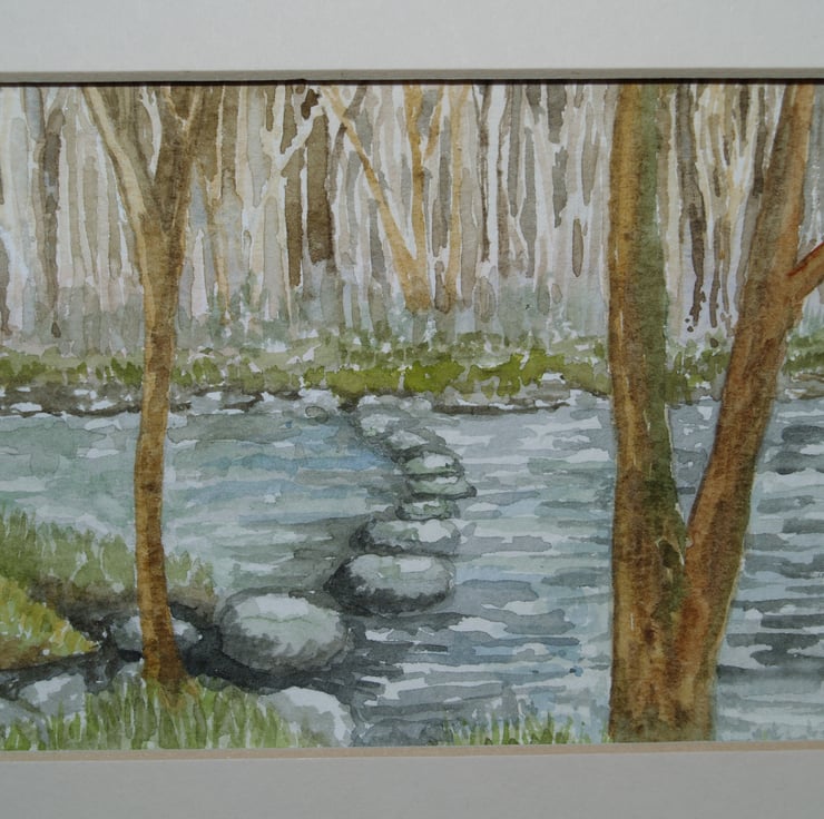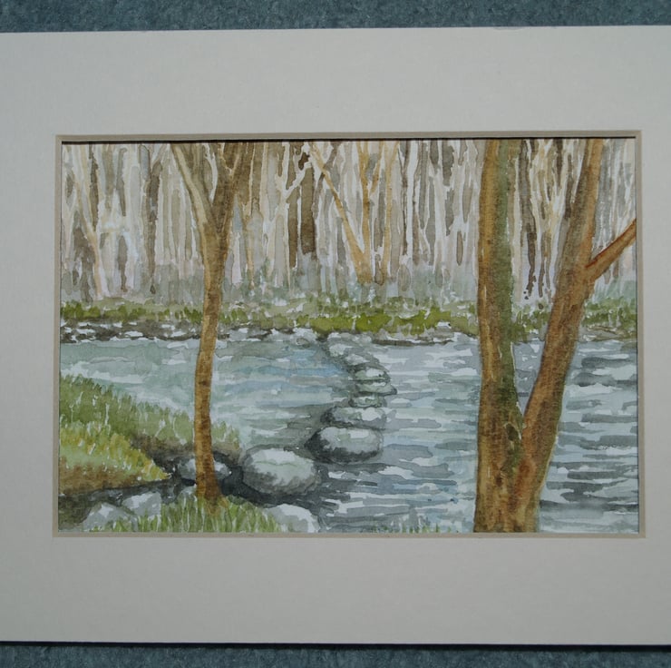 This watercolour of stepping stones across the river in the woods has been painted onto an A6 watercolour 300gsm postcard using artist's quality watercolour paints. It measures 4.1 x 5.8 inches (10.5 x 14.8cm). The postcard is able to be used for writing on the back, but would need to be placed in an envelope before posting, or laminated, as the painting has been created using original watercolours on the front!