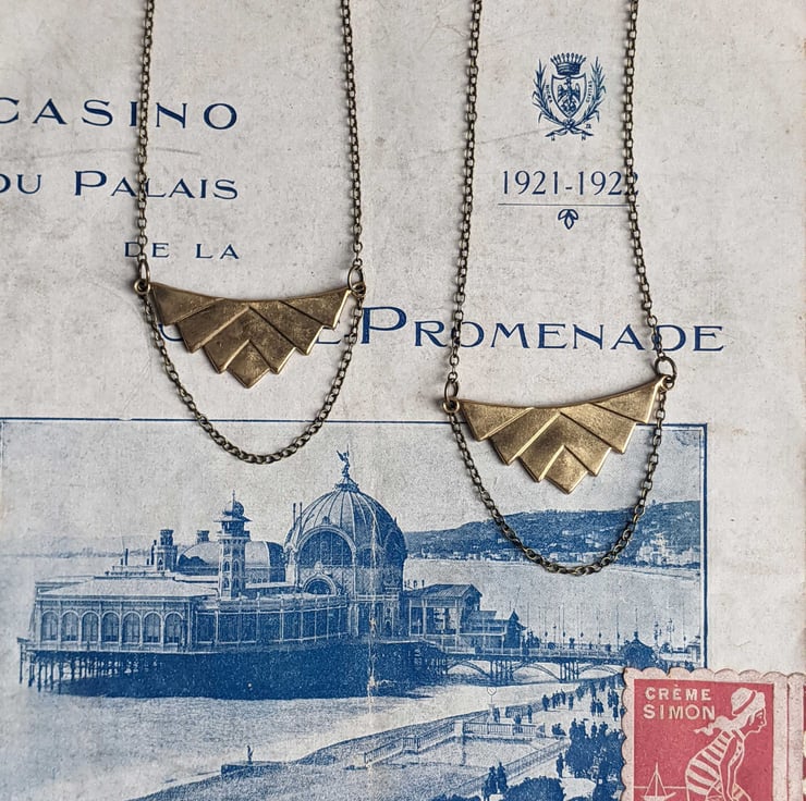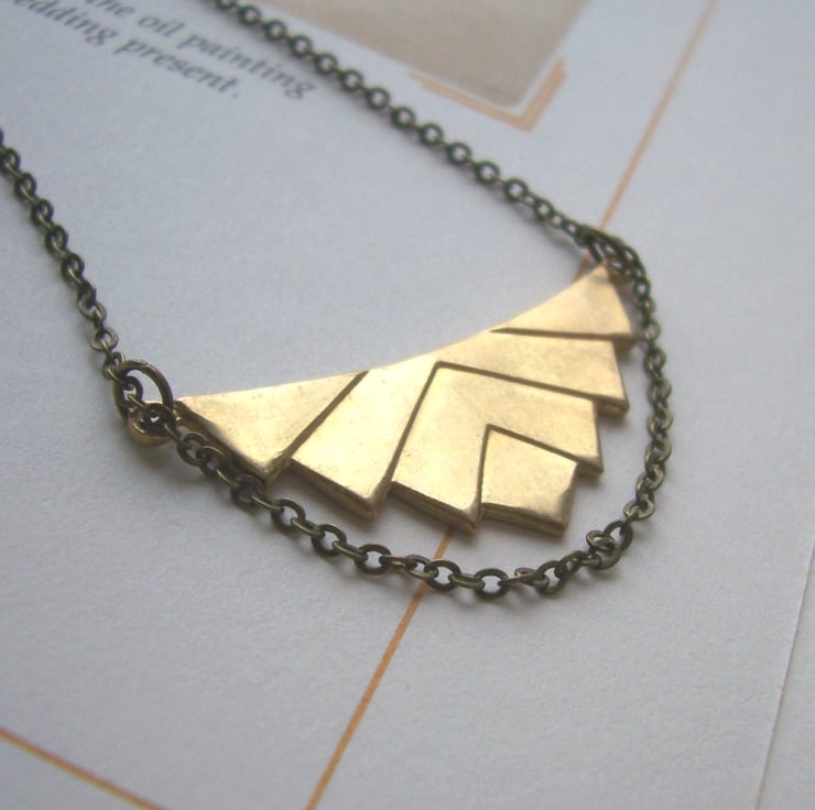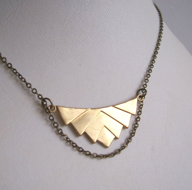 This beautiful golden brass pendant has fine chain draped around it, held in place at each tip.