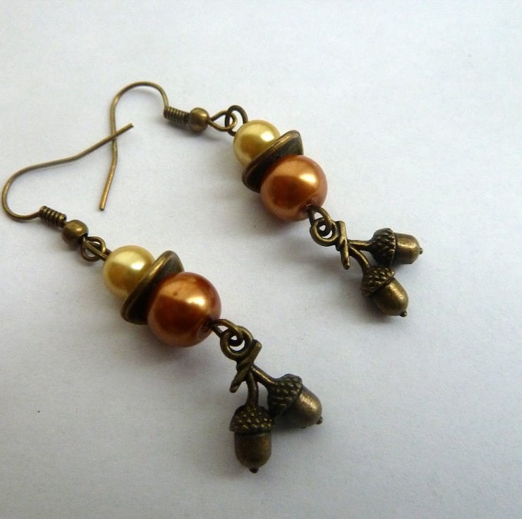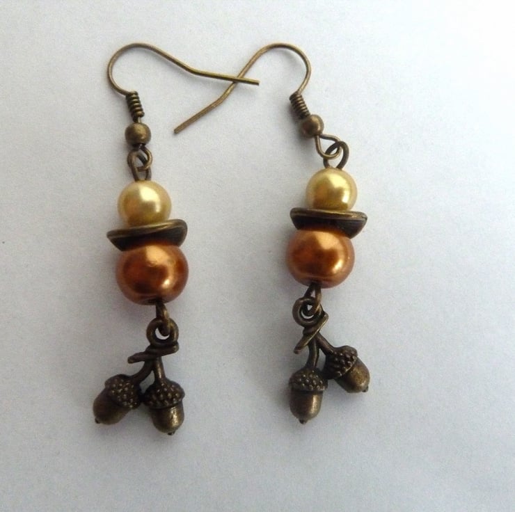 A pair of bronze earrings which feature gold and brown glass beads with bronze acorn charms.