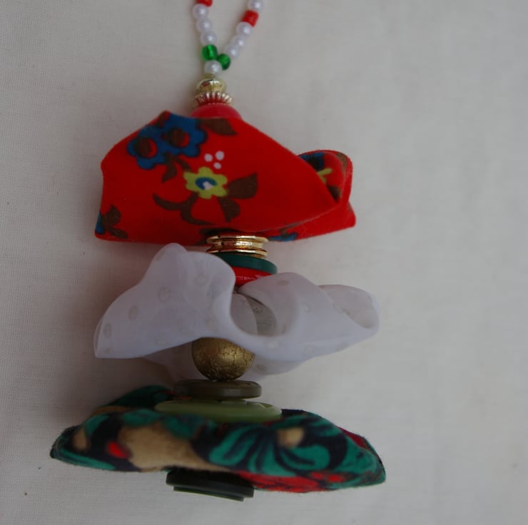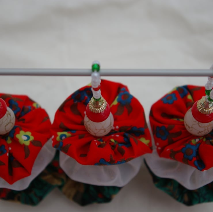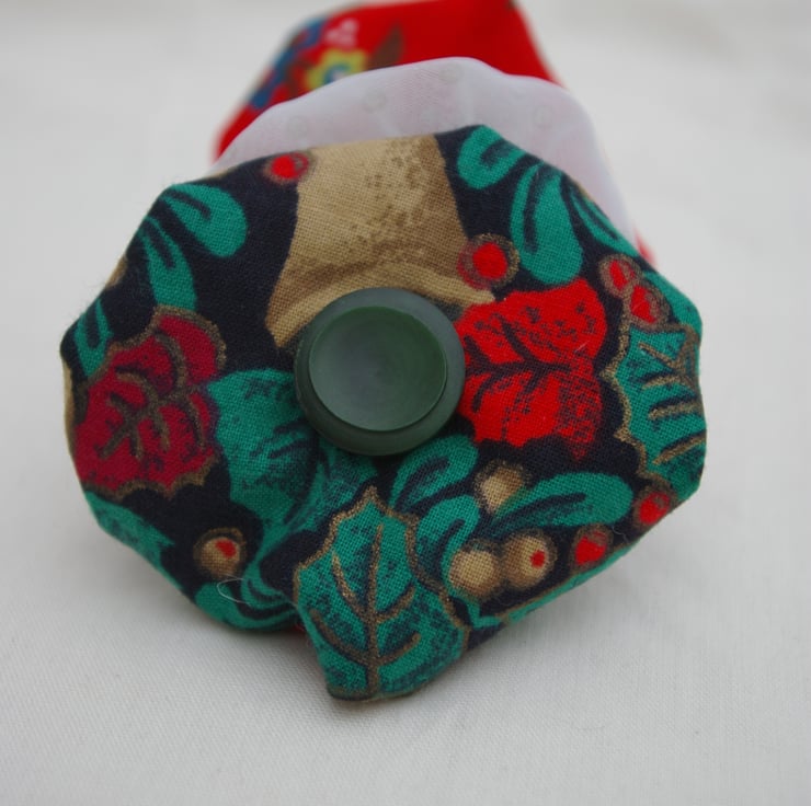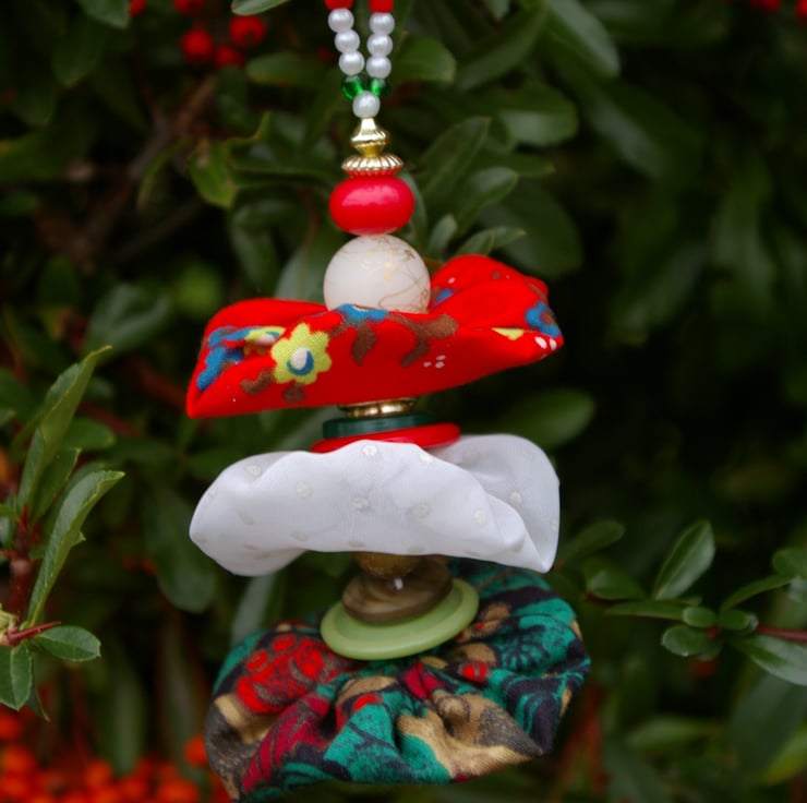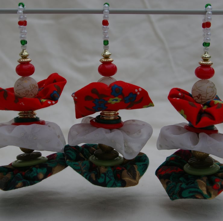 Three very special Suffolk Puff Christmas Decorations. Each one has been hand sewn and contains 3 different Suffolk Puffs one in green, one in red and one in white. Between each layer of Suffolk Puff are a selection of beads and buttons in red, green and gold.