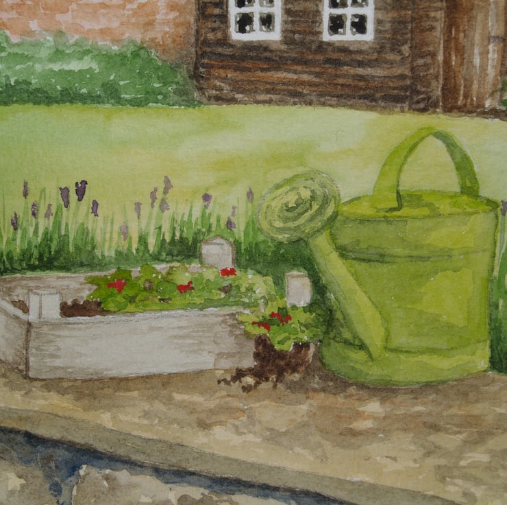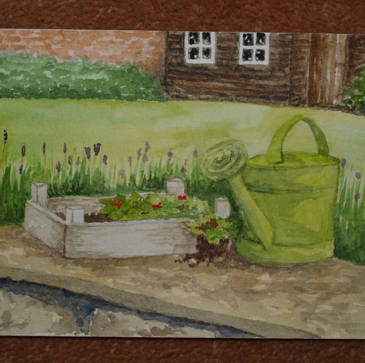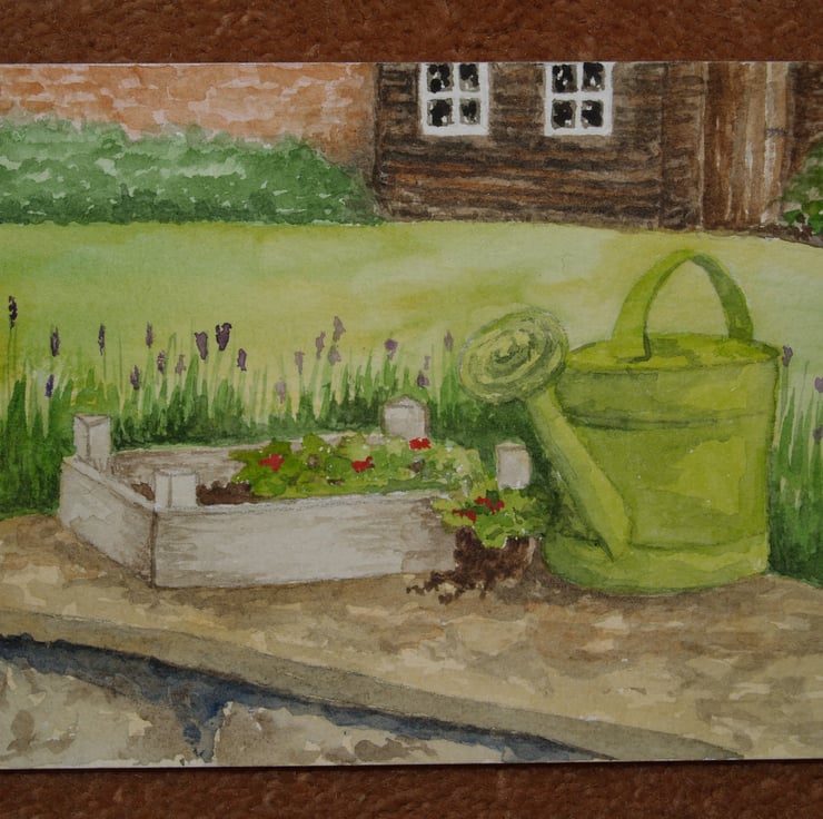 This watercolour of a watering can and bedding plants in the garden has been painted onto an A6 watercolour 300gsm postcard using artist's quality watercolour paints. It measures 4.1 x 5.8 inches (10.5 x 14.8cm). The postcard is able to be used for writing on the back, but would need to be placed in an envelope before posting, or laminated, as the painting has been created using original watercolours on the front!