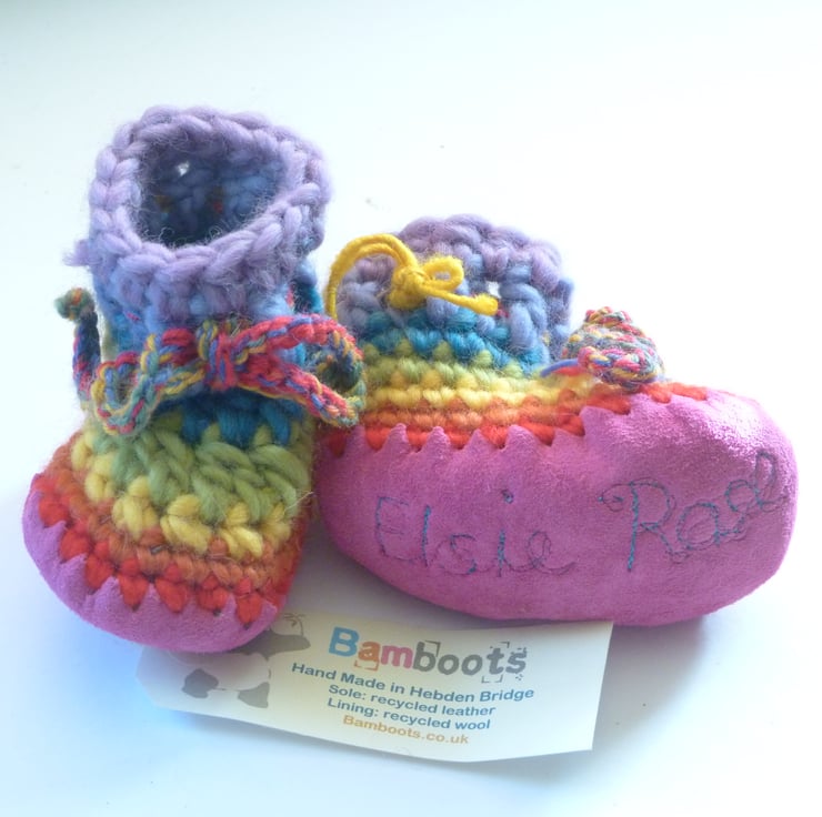 Delighted to have found this lovely soft Norwegian wool in all the colours of the rainbow. now customizable with name embroidered on sole.