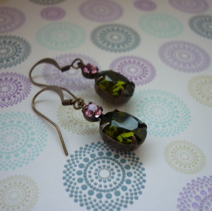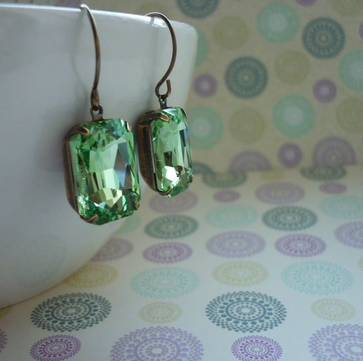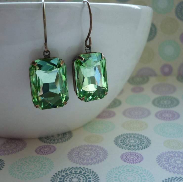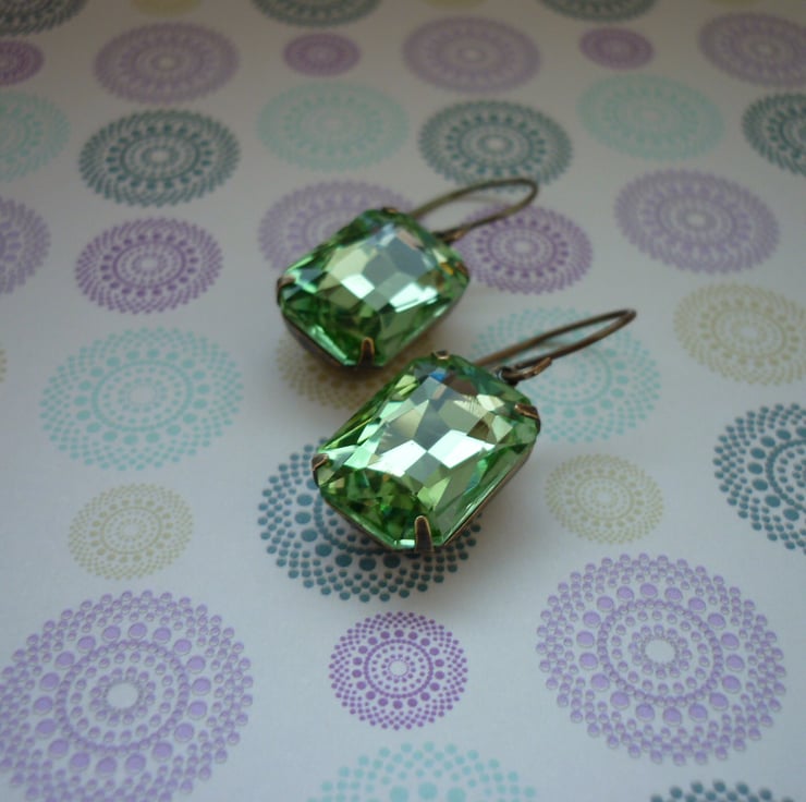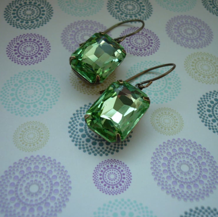 THERASS EARRINGS HAVE BEEN MADE WITH 18 X 13MM OCTAGON SHAPED PERIDOT GREEN RHINESTONES SET IN PATINA BRASS VINTAGE STYLE SETTINGAND FINISHED WITH VINTAJ BRASS EAR WIRES.