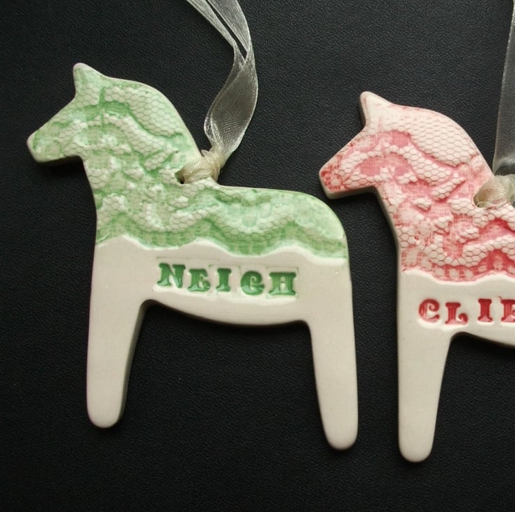 These cute little horses are cut from white earthenware clay and decorated with a lace imprint