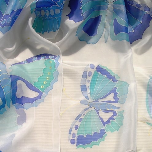 Hand painted lightweight silk scarf in blue and turquoise butterfly design. Size of scarf 150cm x 40 cm. 100% colourfast and hand washable. This scarf can be supplied in a gift box if required at a cost of £22.00.