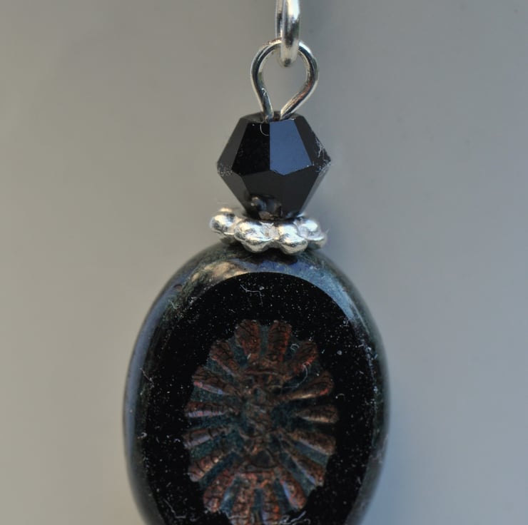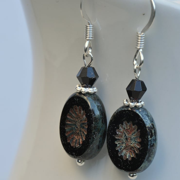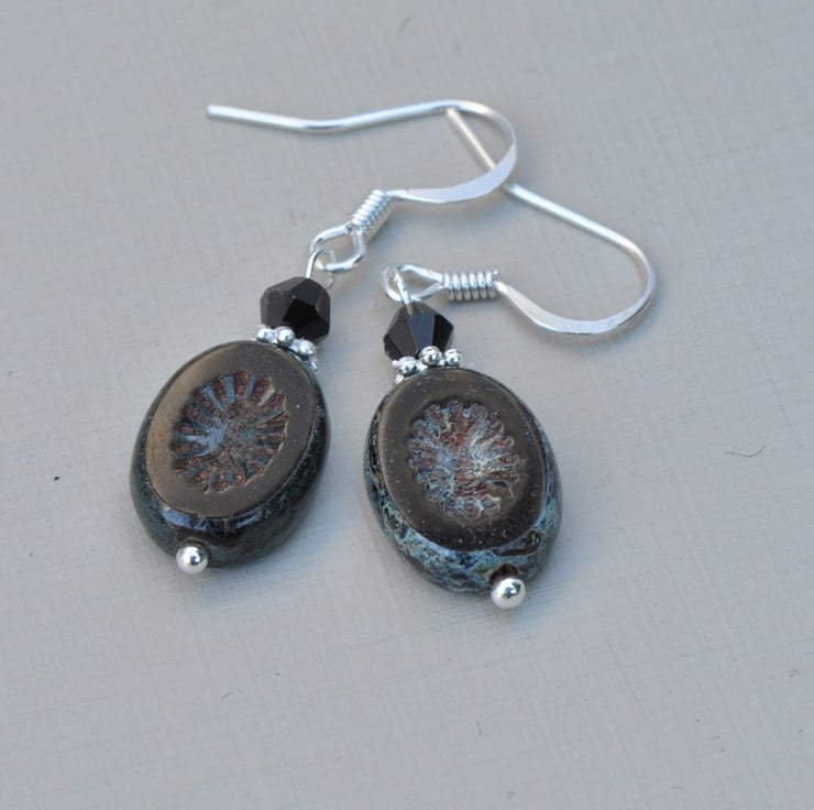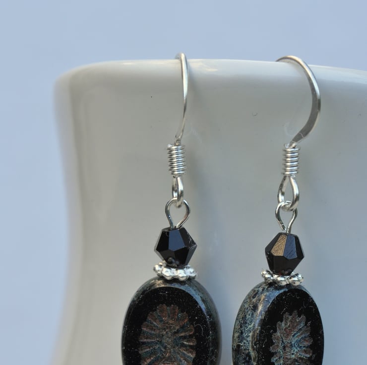 Czech glass Picasso finish oval cut beads are the focal of these earrings which I have teamed with little silver plated spacers and black bicone glass beads finished on silver plated earwires.