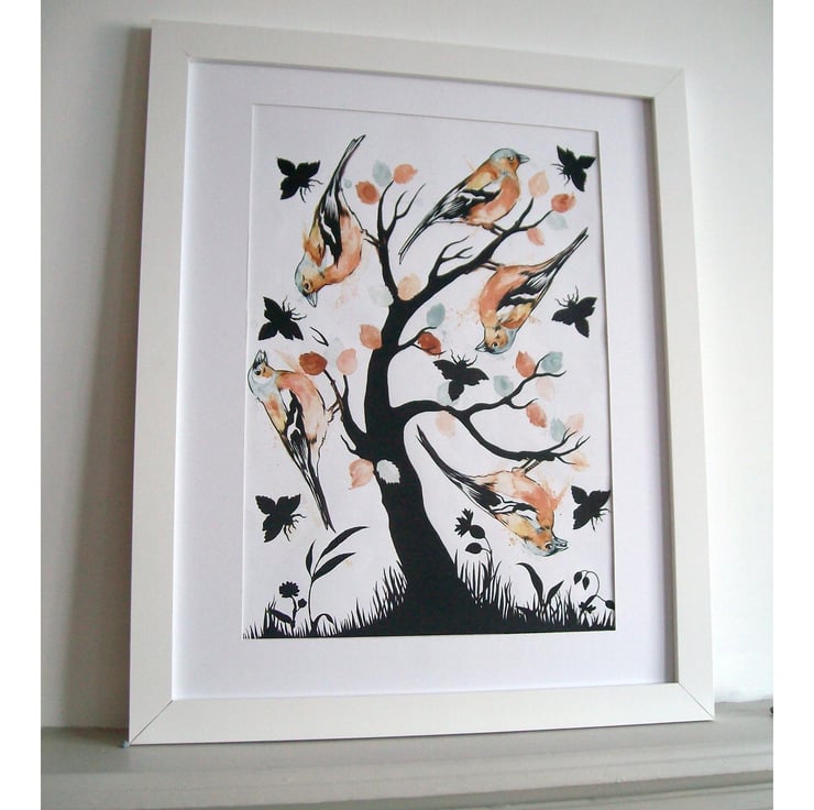 Here is an A3 Print (11.69 by 16.54 in) of a group of chaffinches sitting on a tree