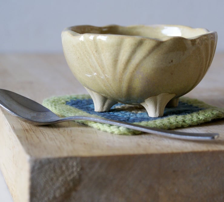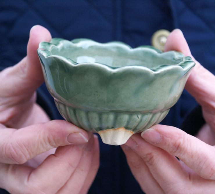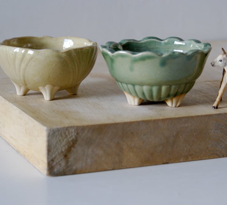 Each one was created from British white stoneware clay featuring an ornate sculpted shape, tripod feet and scalloped edging. Glazed in forest green and pepper yellow these have a high shine and are glossy to the touch.