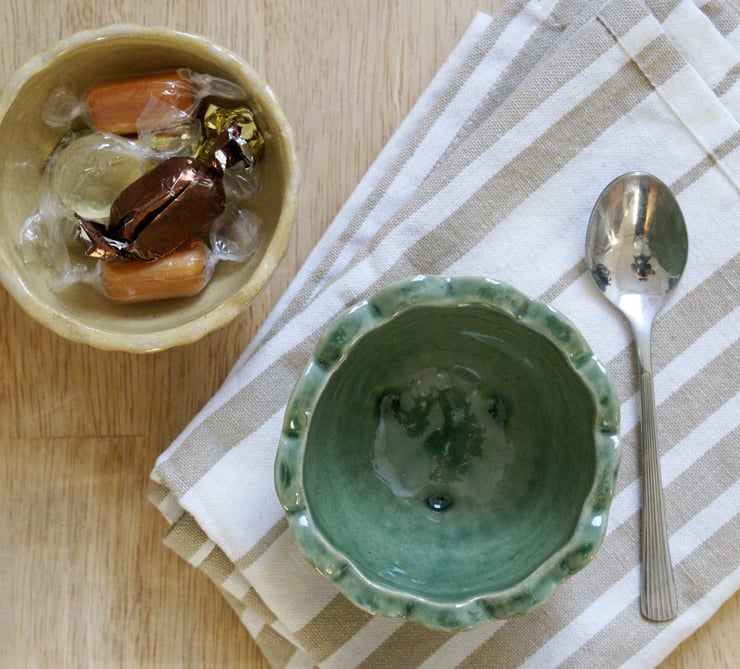 These two pottery trinket dishes are ideal for serving small portions of indulgent snacks or storing things that easily go missing such as keys or pocket change. These decorative bowls would add a touch of colour on a bedroom dresser for rings and earrings.