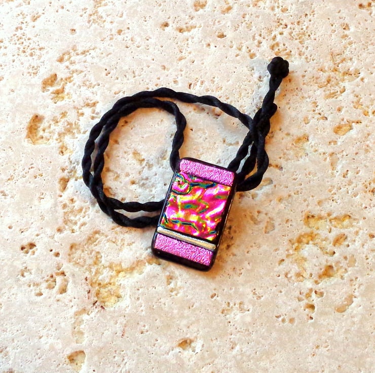 The pendant is slightly over 4cms x 2cms. It hangs by a silver-plated sliding bail from a 50cm silky black twisted cord with a knot & ball fastening.