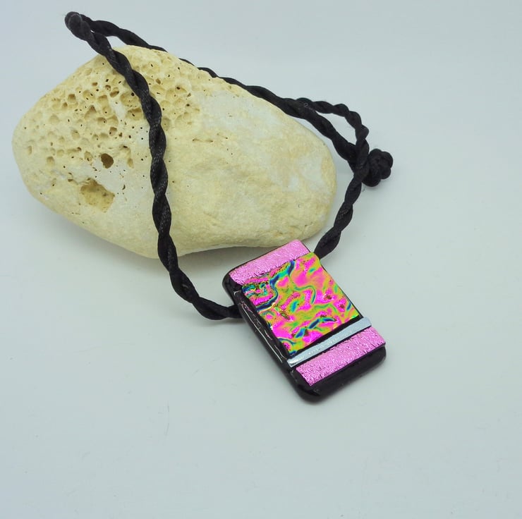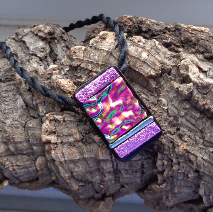 Dichroic glass is known for its vivid colours and those same lovely colours are often difficult to truly represent in photographs. The camera cannot capture the movement of the central vividly coloured panel. Fortunately, whatever the picture – the real thing very seldom disappoints!