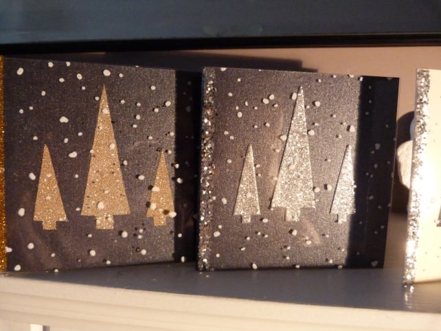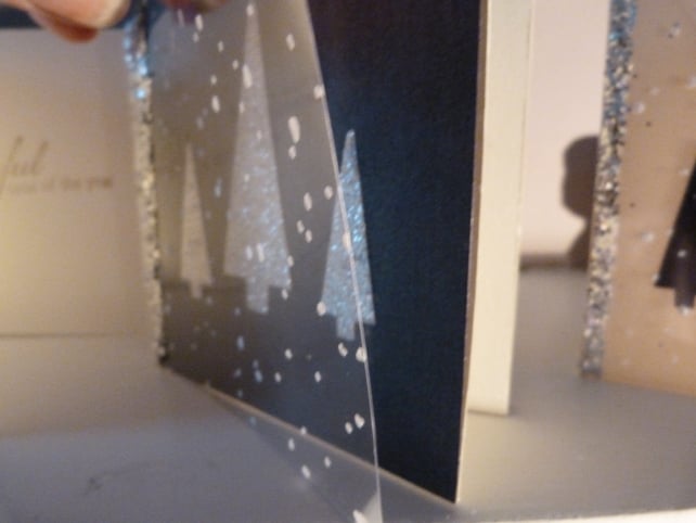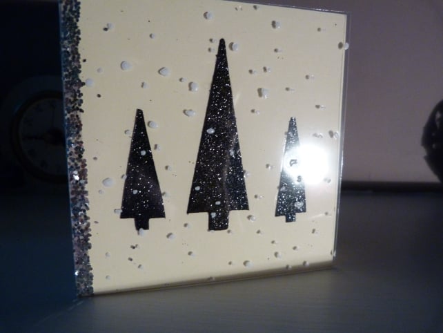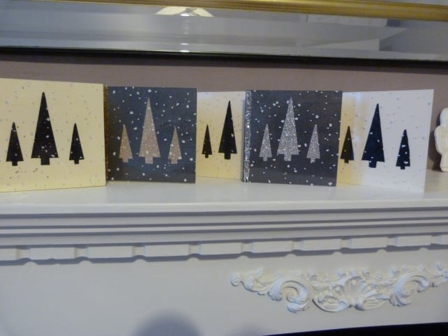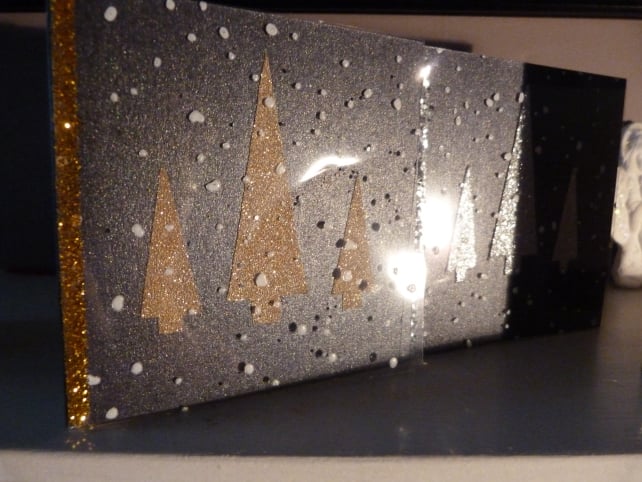 A set of 5 assorted cards. Trees cut from glitter card, the silver trees mounted onto quality dark blue card, gold glitter trees on dark blue card, the black trees mounted onto quality cream card. Covered with snow acetate and edged in co-ordinating glitter.