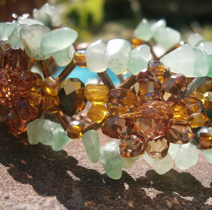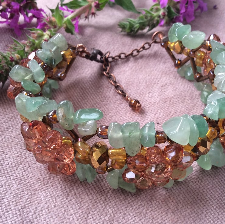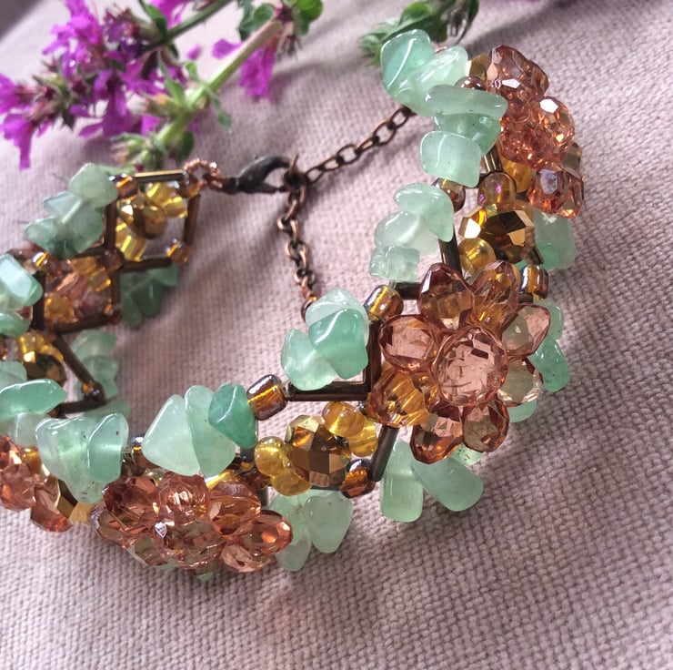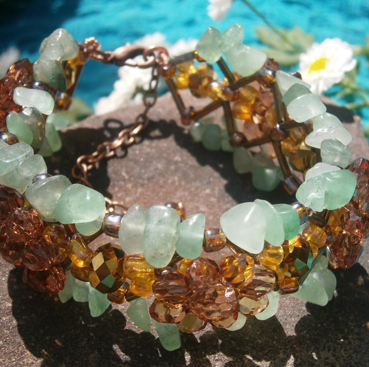 A beautiful chunky bracelet, adorned with semi-precious jade chips, gold Czech glass faceted beads, gold tone seed beads, bronze bugle beads, and amber lucite flower beads. Woven together in a beautiful hugz and kisses weave, and fastened with a copper tone lobster clasp.