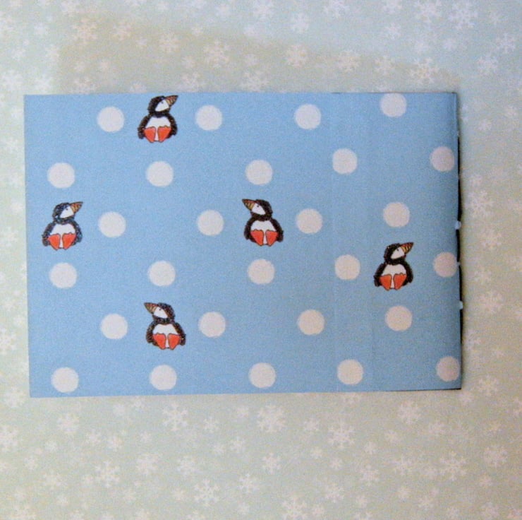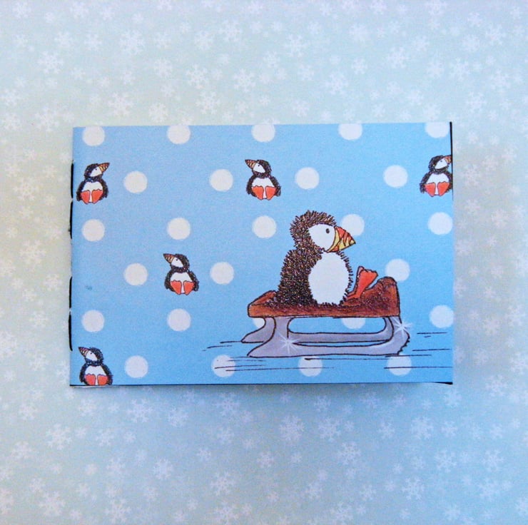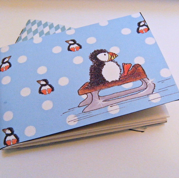 A Pocket sized Sketchbook, or notebook, 15 x 9.5cm (3.75 x 6), with a sweet little winter penguin on the cover. Handstitched with black linen thread.