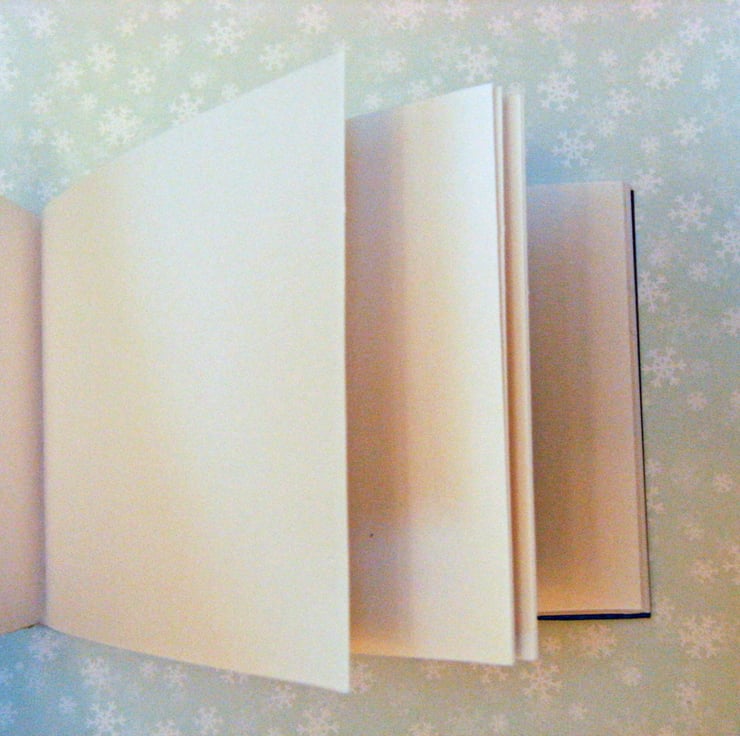 The covers are of stiff black card, with a decorative paper overlay by Papermania, with a pattern of white dots and baby penguins on a pale blue background, with a sweet little penguin on the front, riding on his sledge.
