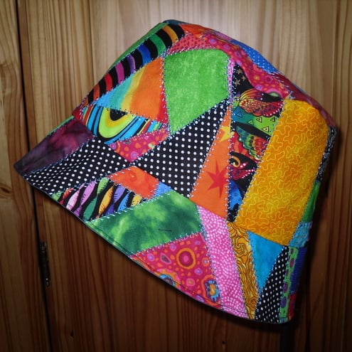Using a variety of bright cotton fabric scraps, I created a crazy patchwork base and then embellished this with machine feather stitch embroidery. I have tamed this wild hat creation with a subdued lining in pale grey cotton.