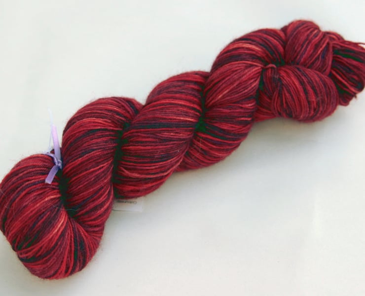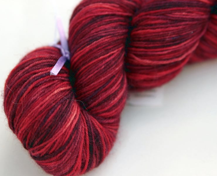 Shades of red with burgundy, brown a little purple and a little orange. This Bluefaced Leicester superwash yarn is soft with a very slight lustre. Photographs have been taken and edited in brightish but wintery natural light.