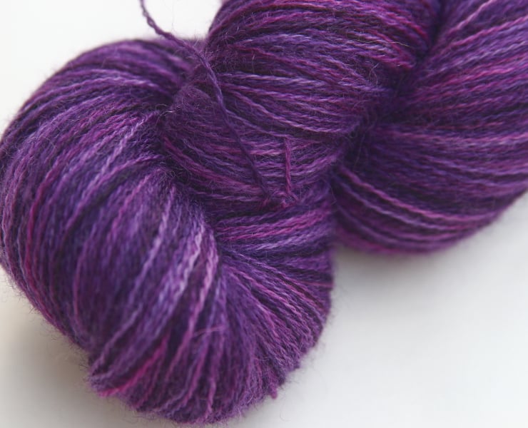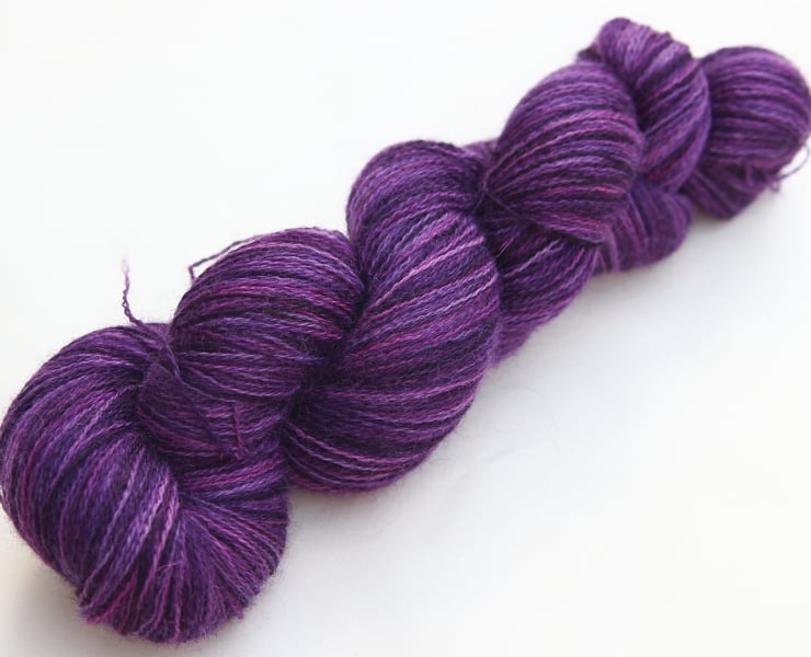 Shades of purple - purple, byzantium, violet and a little pink. This lustrous, lofty and slightly fuzzy yarn should make beautiful lace projects. Photographs have been taken and edited in brightish but wintery natural light.