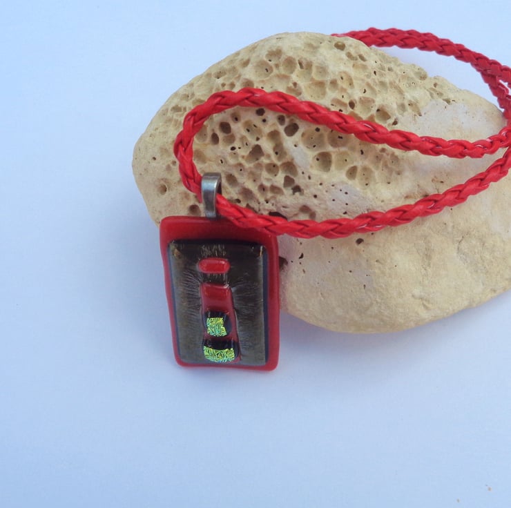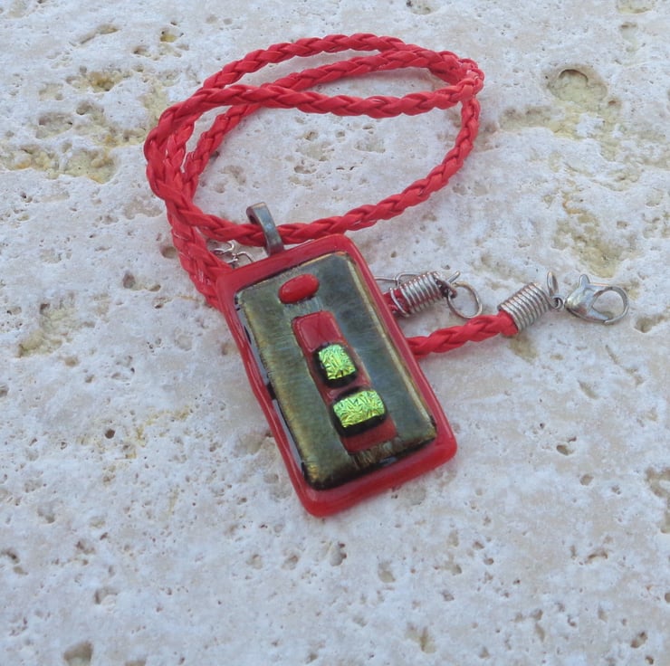 Red, bronze-brown & crinkle-textured gold glasses form a pendant 3.5cm long by 2cm wide. It is suspended by an antiqued silver-plated bail from a 43cm braided faux-leather necklace.