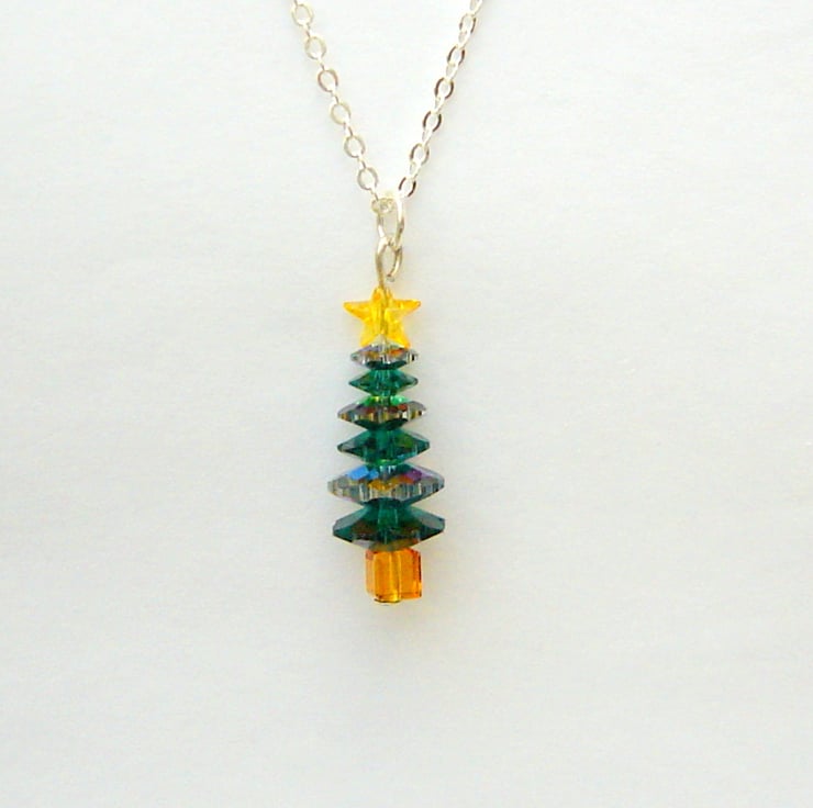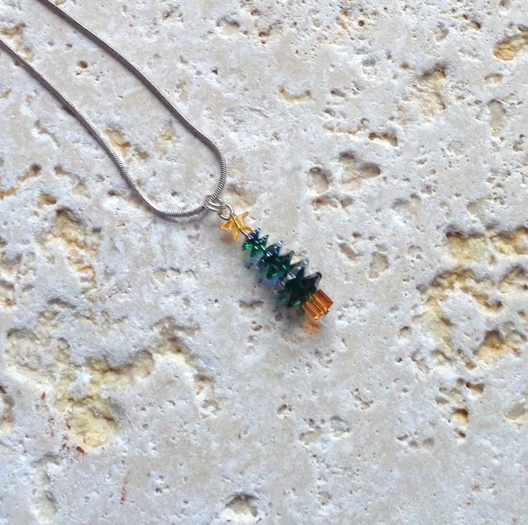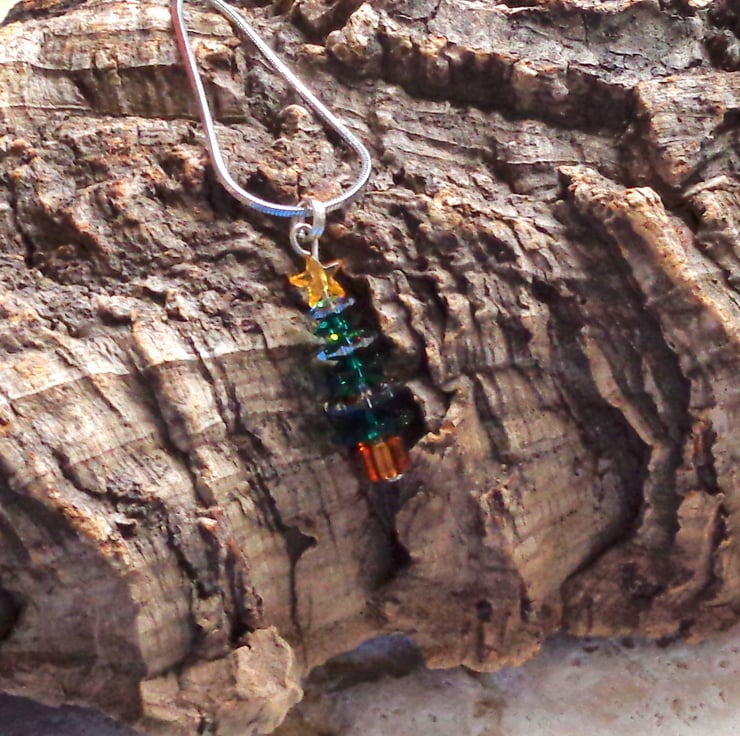 The crystal beads are genuine Swarovski (basically, the best in the business!) & are a mix of dark & rainbow green (green AB). The star is acrylic, whilst the findings are silver-plated. The tree measures just 3.5cms & comes complete with a 17" silver snake chain, ready to wear.