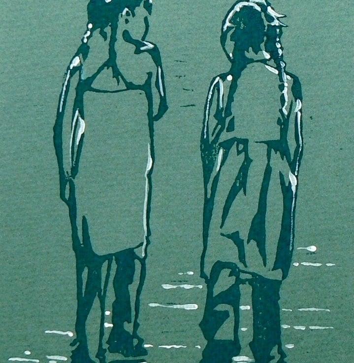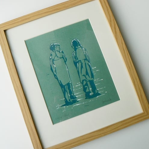 This linocut is handprinted, with white ink added to give a little sparkle. It is printed on green 160gm paper, in a blue-green ink.