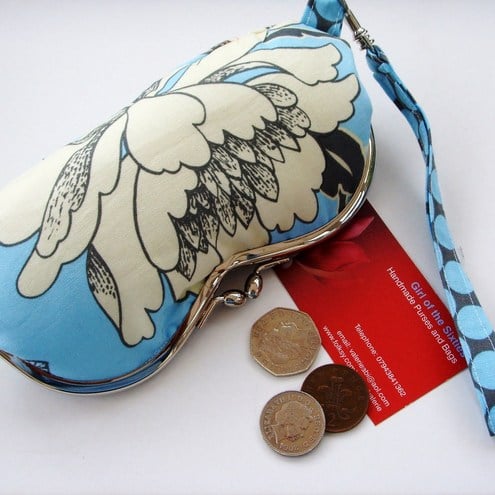 Charming little wristlet purse for sunglasses or mobile phone in pretty Amy Butler fabric with contrasting lining and removable wrist strap. Measures approx 7"x3.5"