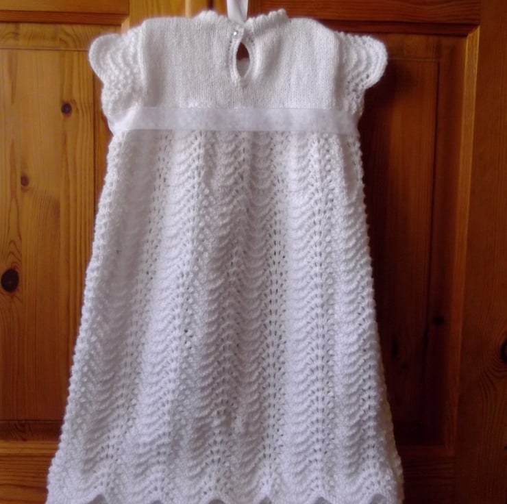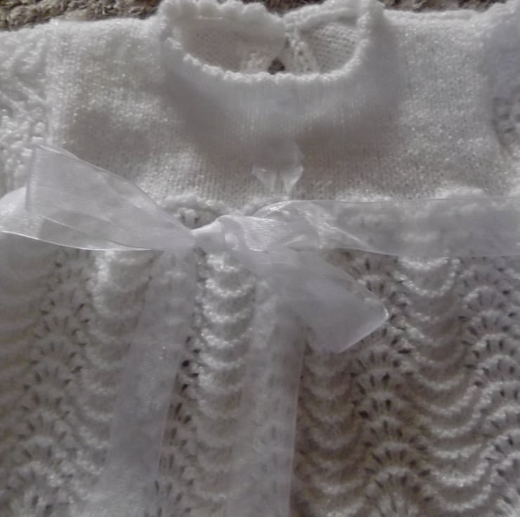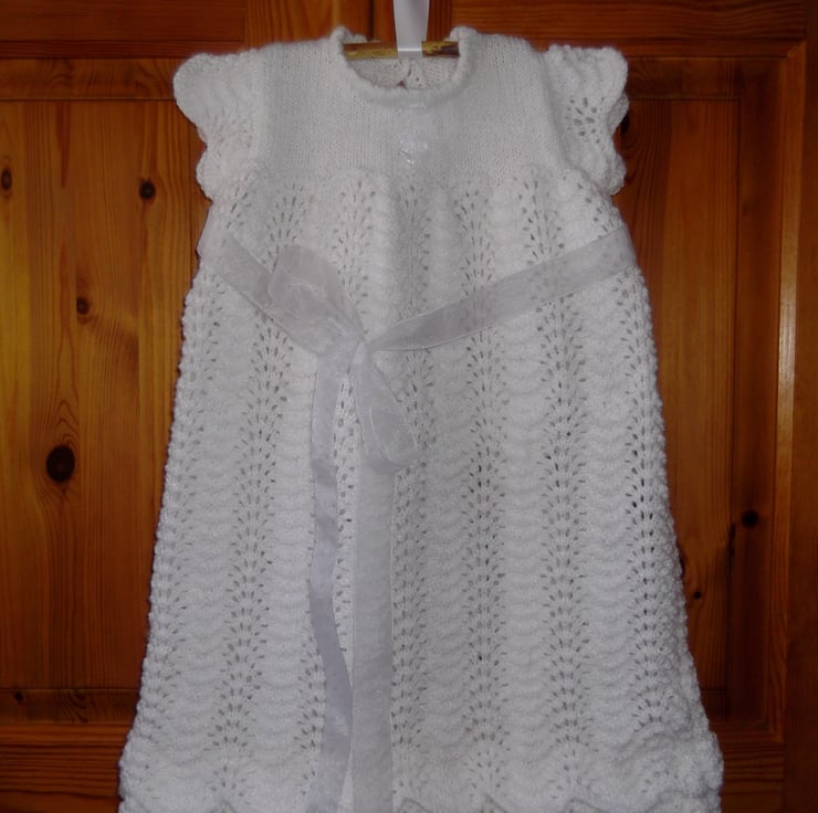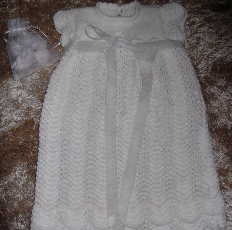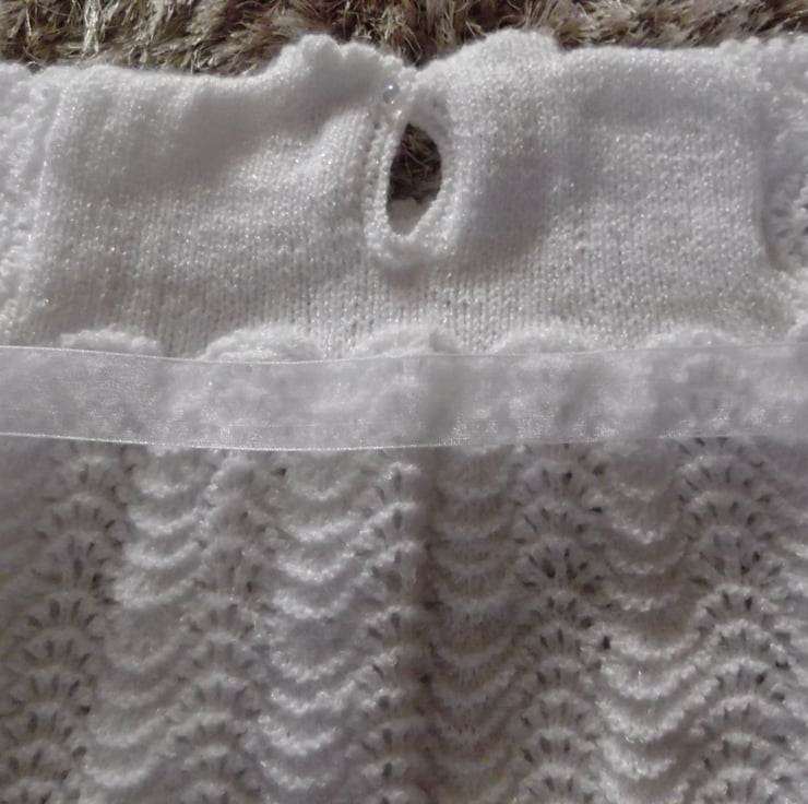 This beautiful christening dress is knitted in a soft white wool with a pearl shimmer.It has a pretty lace design with three layers of frill along the hemline.It has sweet little cap sleeves.To finish off it has a pearlised button at the back of neck,and two tiny satin bows on the bodice.There is a white satin ribbon to tie around waist but this is optional.Will fit size 0-6months.