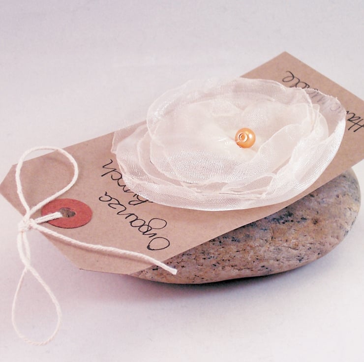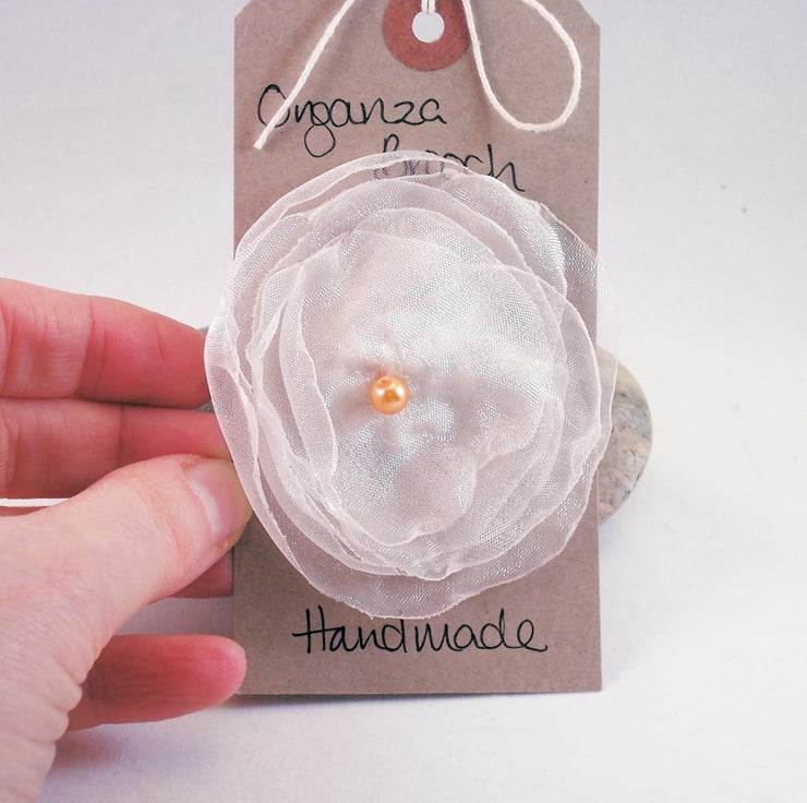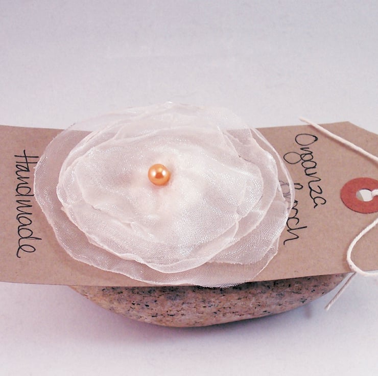 Layered organza flower with peach glass "pearl" centre. Mounted on silver coloured metal brooch pin.